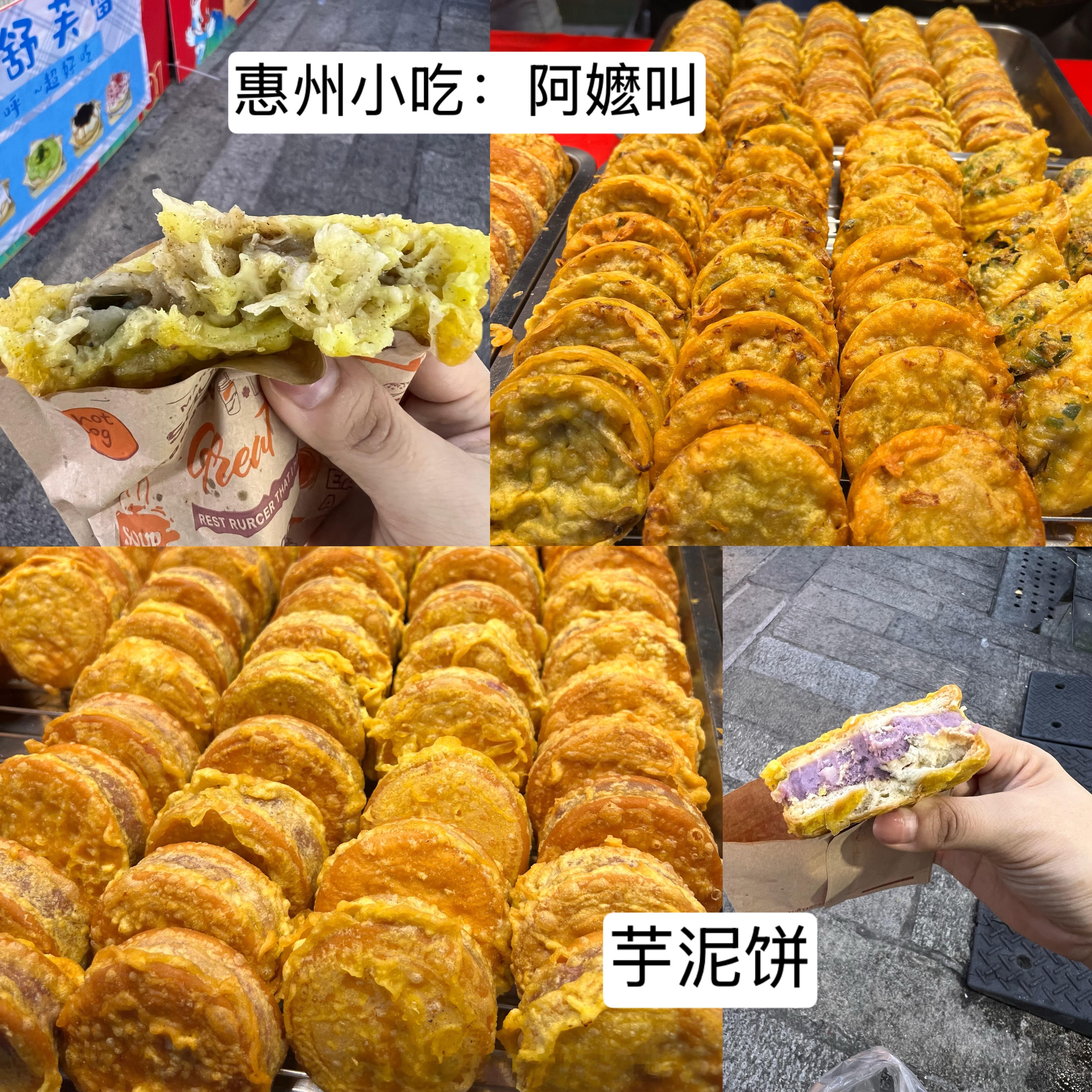 🫓说到美食,惠州有种独特的小吃,名字很有意思,是“阿嬷叫”。其实就是油炸白萝卜虾皮饼。传说做这个饼的老板怕油溅到孩子,就对孩子说“你阿嬷叫你回家”,久而久之就叫“阿嬷叫”了。