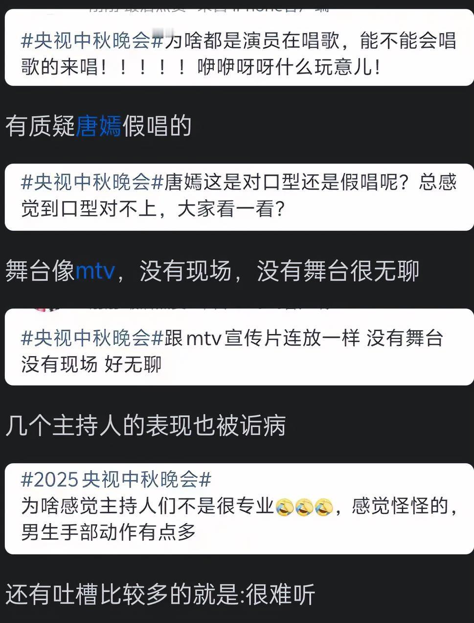 万万没想到 央视中秋晚会骂声一片 刚刚开播就遭网友吐槽,看评论都比节目精彩,首先是主持人候佩岑全程紧张僵硬,台词功底差,还不如“谢娜”的硬气功! 歌唱节目更是尴尬,好多非唱歌演员在唱歌,唐嫣更是被质疑假唱,整个晚会一个小时被吐槽“太无聊”。 大家觉得今年央视中秋晚会好看吗?