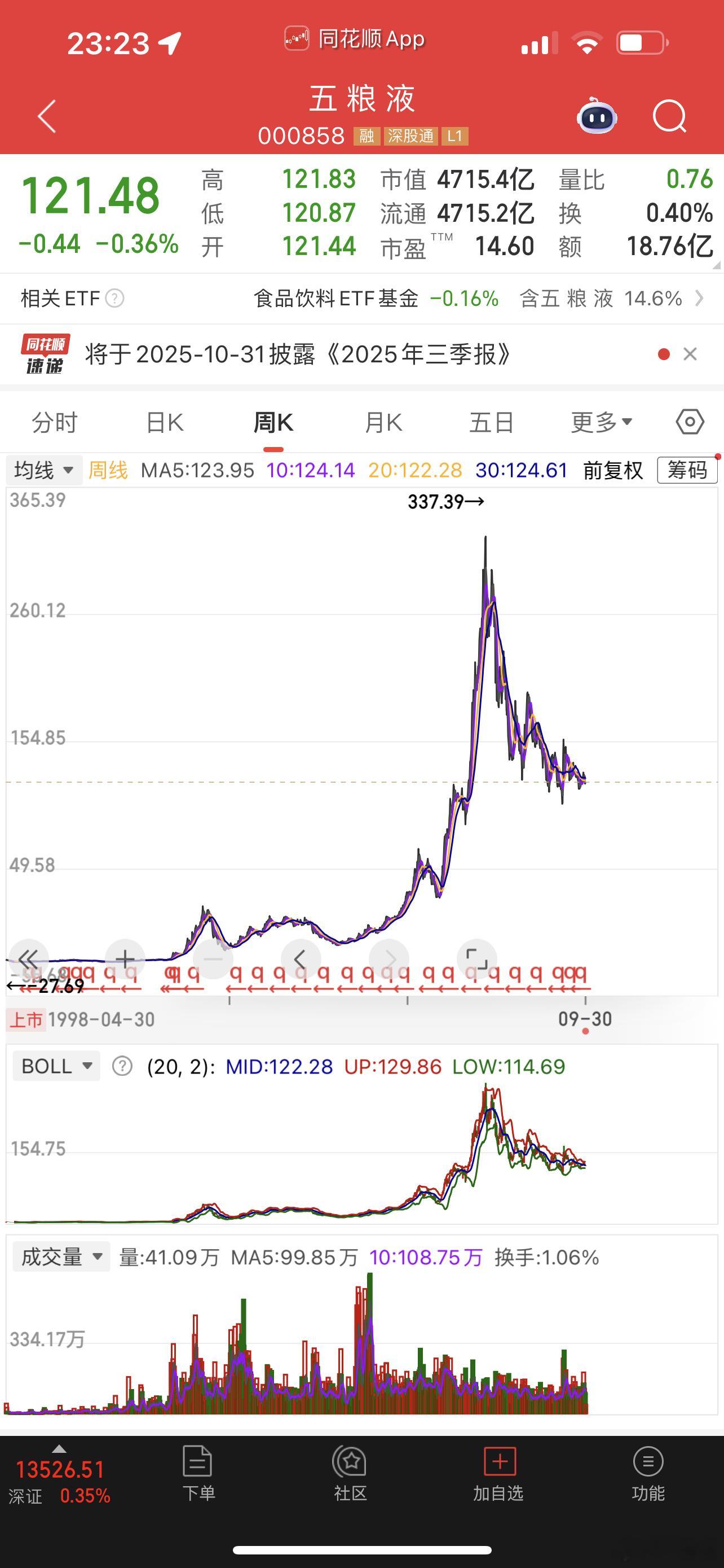 上一轮白酒牛市五粮液涨幅要大于茅台,最近几年跌幅也大于茅台!按比例茅台要是跌到1000元以内的话,那五粮液要跌到70左右! ​​​