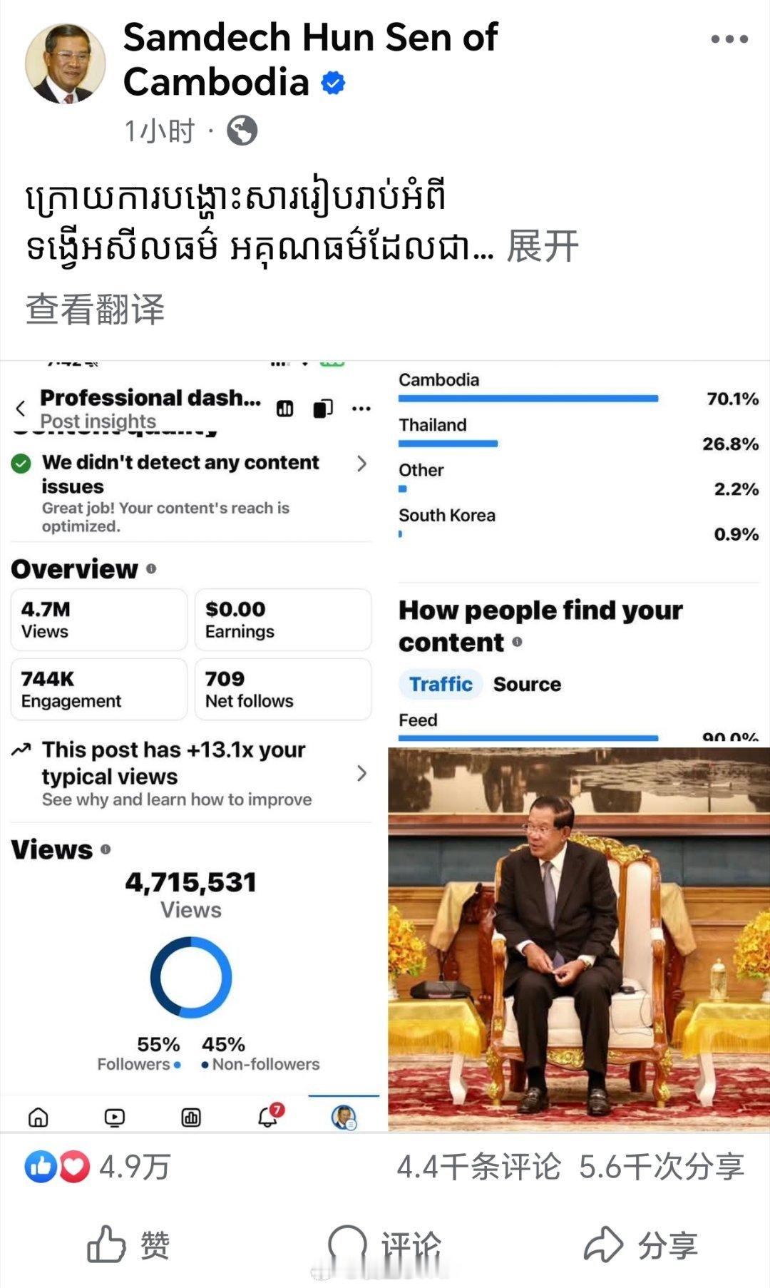 洪森随后又发帖称,在发布了一条描述部分泰国人不道德、非人道、兽性行为的留言后,截至今天晚上7点45分,已有4,715,531人观看,其中26.8%是泰国人,约有100多万人观看,如附表所示。我希望广大观看的泰国人能够以负责任的态度反思自己民族的价值观,因为他们所犯下的种种行为,配不上一个拥有高度文明和文明的国家。