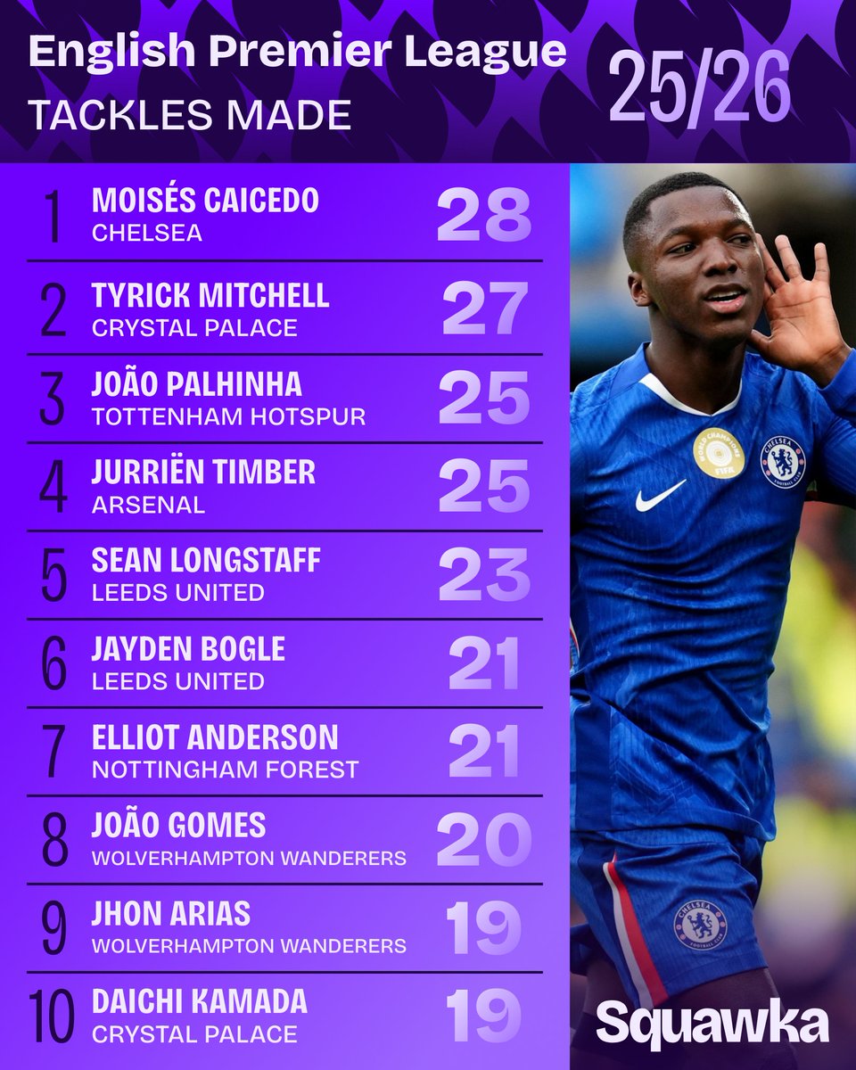 虎扑10月07日讯国际比赛日来临,英超进入休赛期。数据网站squawka统计了本赛季英超的抢断榜。