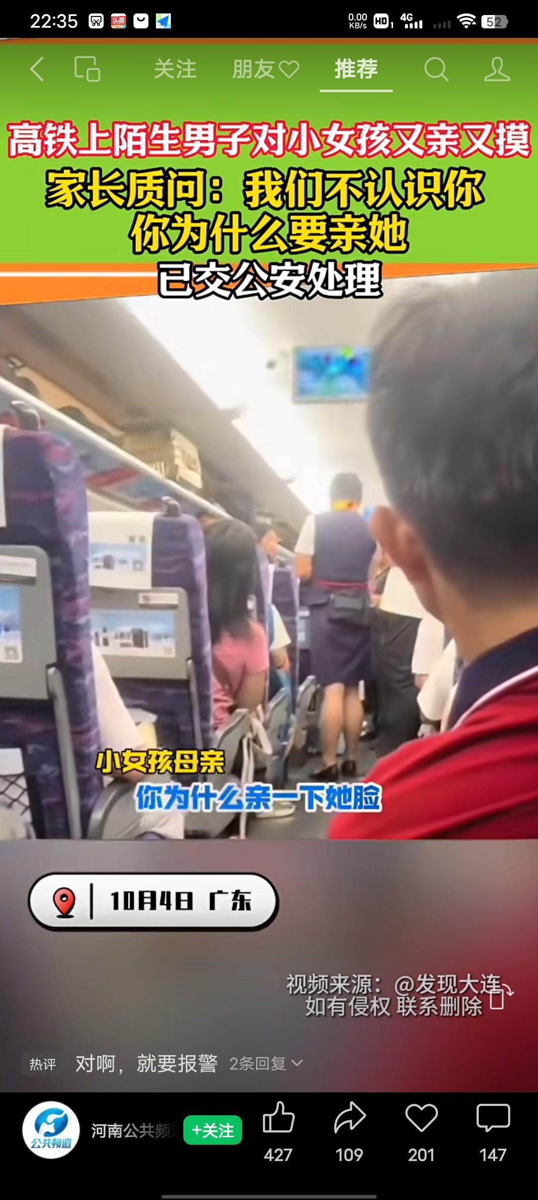 家有女孩的父母一定要看好自己的孩子!尽量禁止陌生人接近女孩。 高铁上陌生男子对小