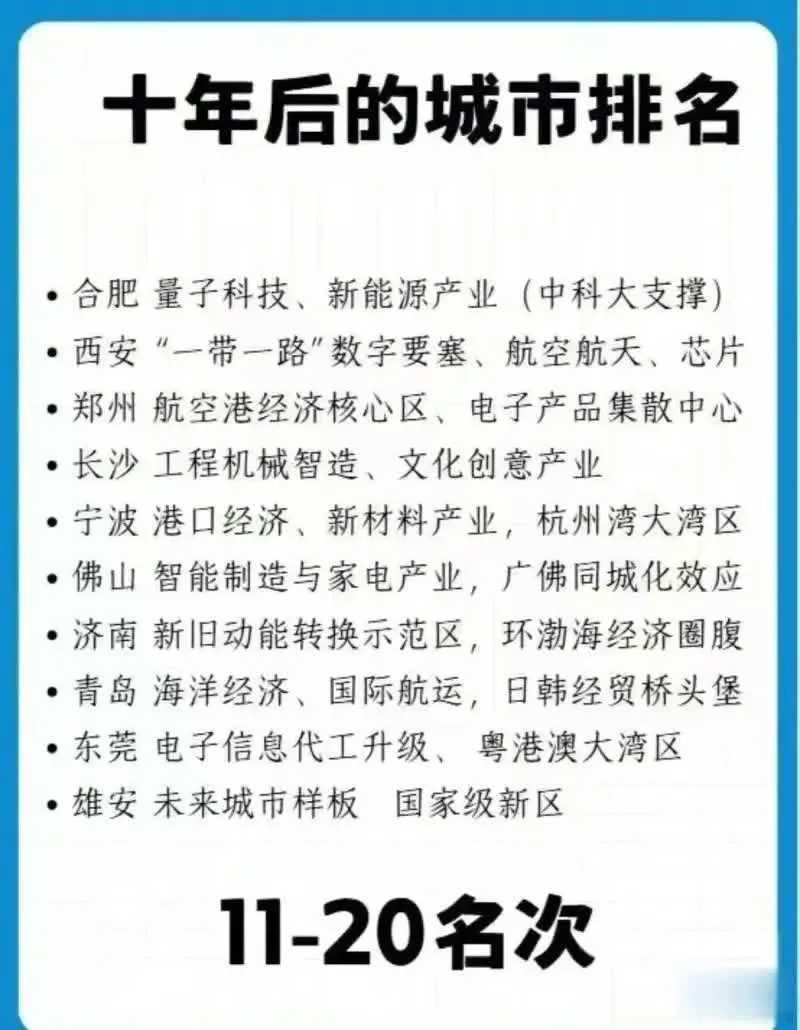十年后中国城市排名肯定会有大变化。现在预测中,深圳是颗闪亮的星。它目前GDP3.68万亿,2030年有望达5万亿。像河套深港科技创新合作区有1.2万多家高新企业入驻,经济产出密度每平方公里150亿。前海完成两千多项跨境金融创新,大鹏湾航运枢纽集装箱吞吐量超3000万标箱。 不过也有说法称深圳、广州未来十年会跌出前五。上海凭借浦东引领区,生物医药产业规模破8000亿,国际金融中心指数居全球前三。南京作为长三角“双万亿”城市,科教优势正转化为创新动能,集成电路产业规模破500亿。城市排名充满变数,让我们拭目以待。