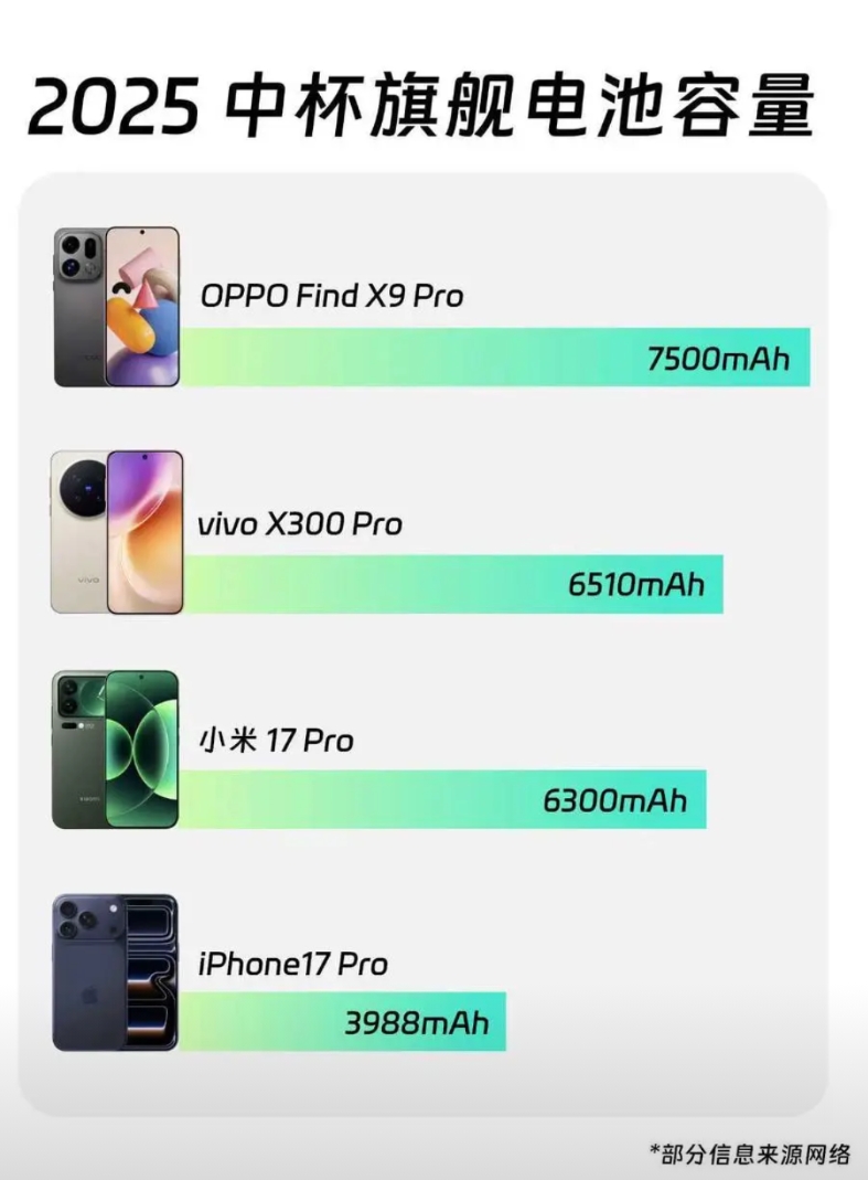 2025下半年新手机电池居然提升这么猛! 作为一个朝九晚七的打工人,真的太怕手机不耐用了 每天上下班通勤刷剧、午休刷短视频、下班回家还要打两把游戏,一天动不动就两充以上简直心累。 最近准备换新机,第一件事就是先翻电池榜,没想到2025下半年各家旗舰电池容量都在集体猛涨! 连一贯在这方面抠抠搜搜的苹果,最新的iPhone17 Pro Max电池都快到5000mAh了。 而安卓这边更是火力全开,即便是标准版机型也都冲上7000mAh档位 比如:OPPO Find X9(7025mAh)、小米17(7000mAh) 特别是OPPO Find X9 Pro更是夸张地塞入了7500mAh 平时地铁上刷剧、午休打游戏都不慌,回家还有电,轻度使用估计都能撑两天! 再加上机身还做到挺轻薄的,而且OPPO在影像和系统上口碑一直不错,这代Find X9系列好像真的找不到短板了! 接下来就看10.16发布价格如何了~