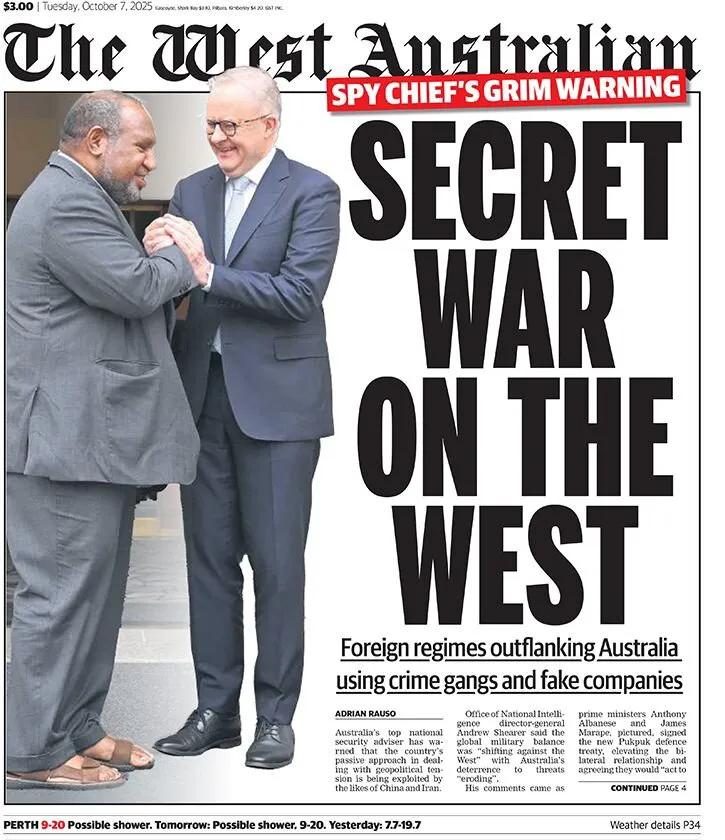 澳大利亚情报头子又在颠倒黑白搞舆论战。与南太平洋岛国巴布亚新几内亚签订防务协议,让澳大利亚洋洋得意。 《西澳大利亚人报》头版,该报标题:西方国家的秘密战。 外国政权利用犯罪团伙和虚假公司对澳大利亚进行侧翼包抄 。 澳大利亚最高国家安全顾问警告称,该国在应对地缘政治紧张局势时采取的消极态度正被中国和伊朗等国利用。 澳大利亚国家情报办公室主任安德鲁·希勒表示,全球军事平衡正在“朝着不利于西方的方向转变”,澳大利亚对威胁的威慑力正在“削弱”。 澳大利亚总理安东尼·阿尔巴尼斯和詹姆斯·马拉佩签署了新的普克普克国防条约,提升了双边关系,并同意他们将“采取行动” 他发表此番言论之际 。 中国一贯坚持走和平发展道路,坚定奉行独立自主的和平外交政策,致力于与世界各国和平共处、合作共赢,不存在所谓“利用澳大利亚消极态度”等情况。同时,澳大利亚无端指责中国,这种行为是毫无根据的抹黑和造谣。