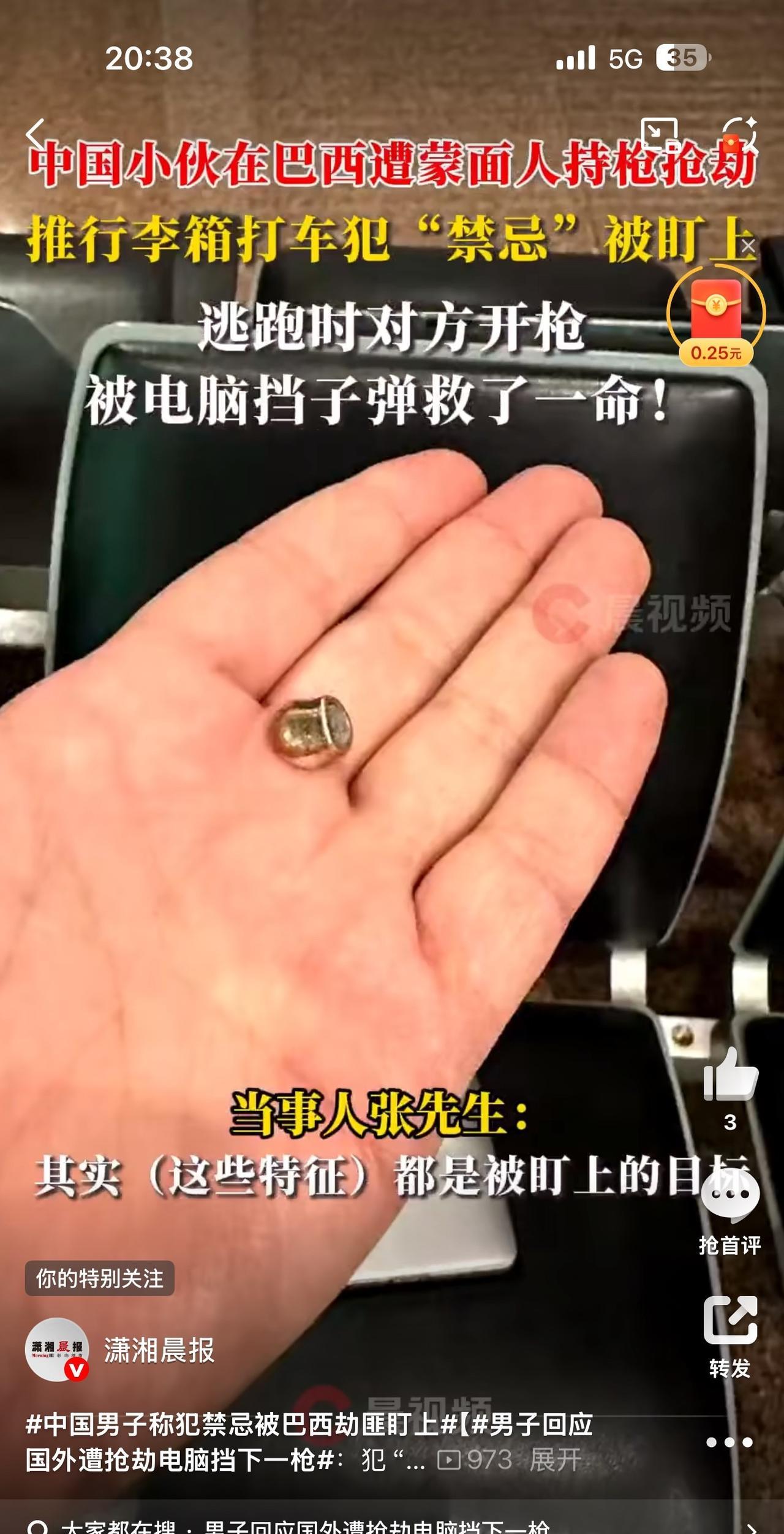 别以为只有电影里面才有打火机挡子弹的桥段,现实生活中也有类似的真实案例,只不过这次是苹果电脑。一中国哥们儿在巴西被抢劫,逃跑时被罪犯开枪射击,当时这哥们儿并没有感觉到被击中,直到在机场过安检时才发现身上居然有一颗子弹,不过幸好是被苹果笔记本电脑给挡住了,而且该子弹已经变形。由此可见当时的冲击力有多么恐怖,要是没有被挡住,那这哥们儿就危险了。这简直就是苹果笔记本最生动、最直接的口碑广告,如果我是苹果,肯定会免费赠送一台最新款的笔记本给这哥们儿,毕竟你花多少钱都不可能有这样的生动效果。[捂脸] #万能生活指南#