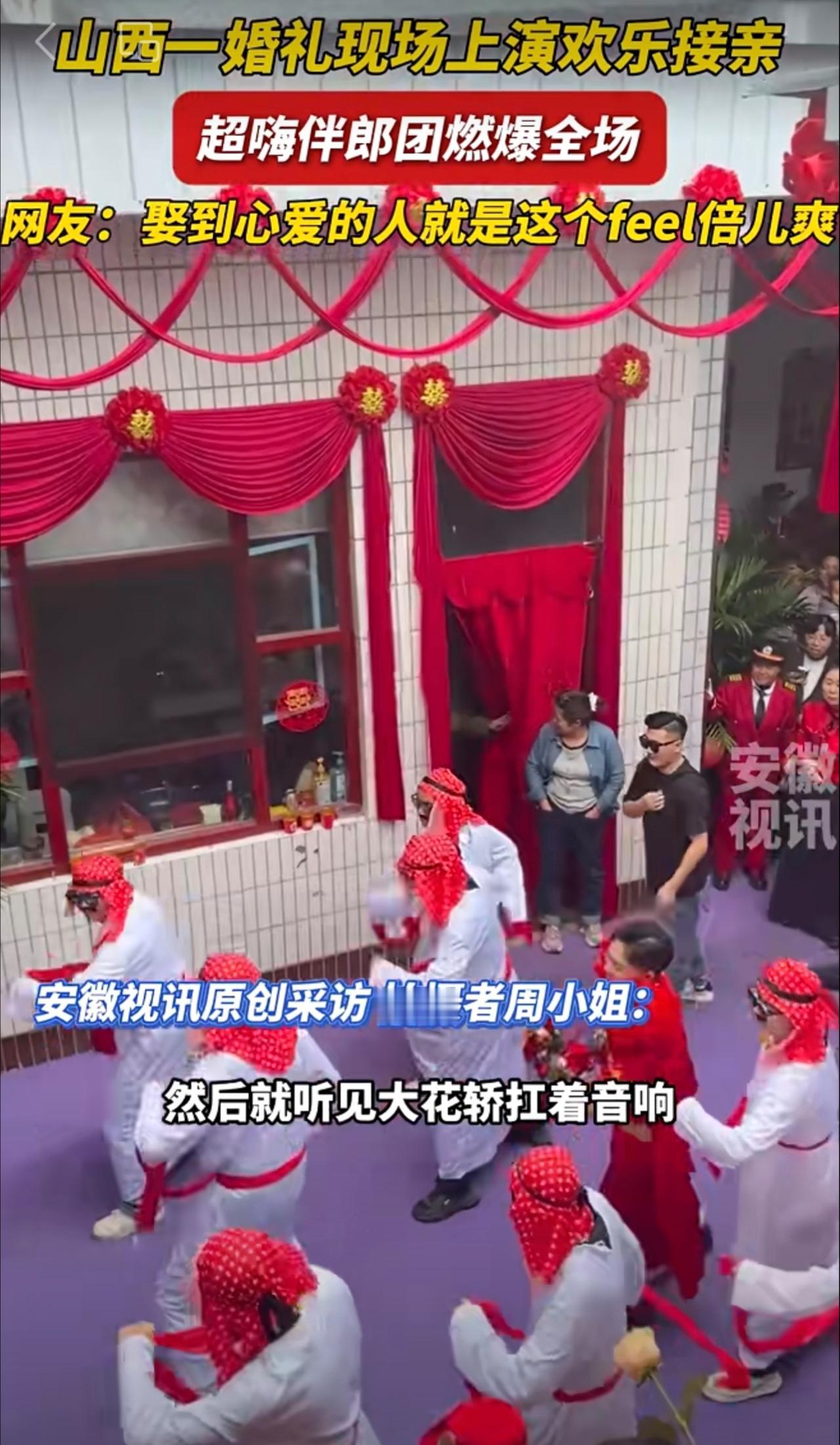 山西一婚礼现场上演欢乐接亲, 超嗨伴郎团燃爆全场。网友:娶到心爱的人就是这个feel倍儿爽!花轿接亲的仪式感有多足 婚宴现场