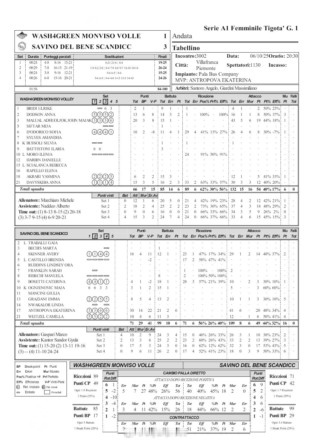 【意甲女排安娃30分斯坎迪奇取开门红 基耶里3-1佛罗伦萨】国际排坛战报速递 10月6日,新赛季意甲首轮,斯坎迪奇客场3-1(25-19/24-26/25-15/26-24)力克蒙维索(皮内罗洛),MVP安特罗波娃30分(41扣20中4拦6发)、斯金纳16分、魏策尔10分,马鲁亚尔20分、达维斯基巴15分、道森13分、德奥多里科10分;基耶里客场3-1(25-13/25-15/21-25/25-15)战胜佛罗伦萨,内尔维尼和MVP安娜-格雷各17分、昆兹勒16分、塞库拉耶夫13分、内梅斯12分,诺尔玛14分、布吉里奇10分;升班马马切拉塔主场2-3(30-28/25-12/27-29/18-25/14-16)惨遭库内奥大逆转,佩鲁贾主场2-3(26-28/26-24/25-18/18-25/13-15)惜败瓦莱福里亚。