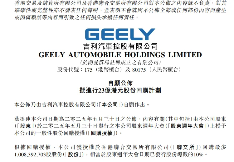 2025年5月30日吉利汽车股东年会上授予的一般性股份回购授权,公司计划回购不超过10.08亿股,相当于股东年会日期已发行股份总数的10%,回购的股份将予以注销,以优化股本结构。