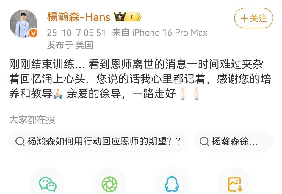 不知道杨瀚森发这条悼念文时该有多难受! 杨瀚森还有两天就NBA首秀了,恩师徐长锁却因病突然离世,再也看不到爱徒在最高篮球殿堂展示自己了。 杨瀚森自打去了青岛之后一直是徐导单练他格外照顾,小杨如今的发展离不开他的发掘和培养。 除此之外丁彦雨航也是徐长锁指导发掘的。
