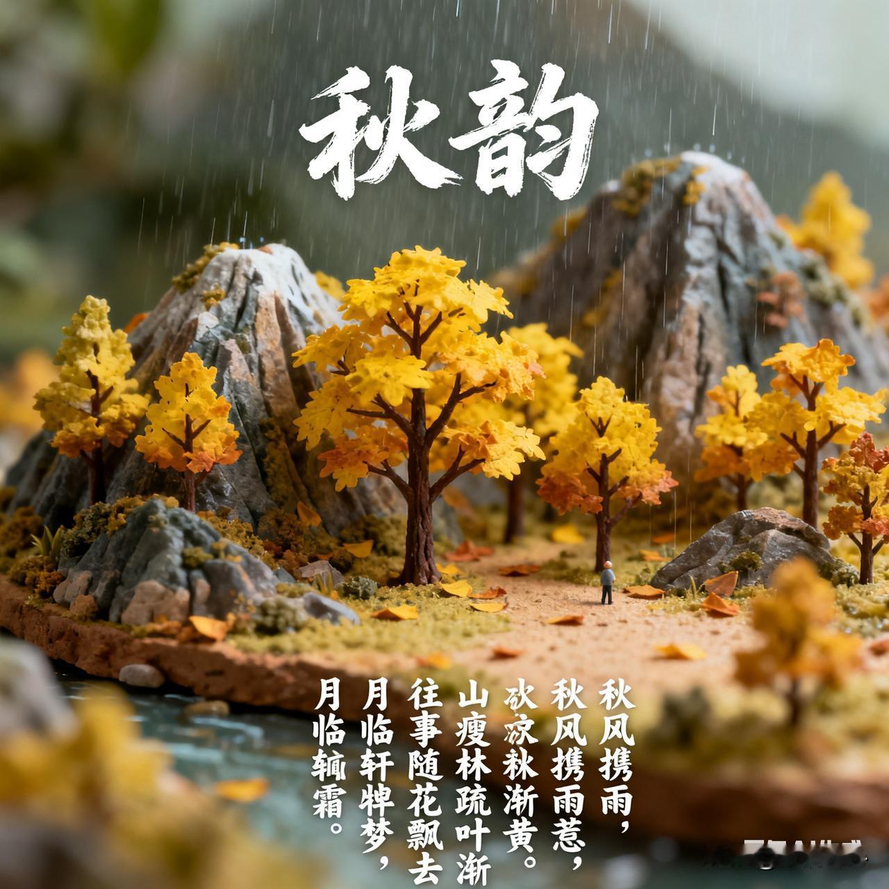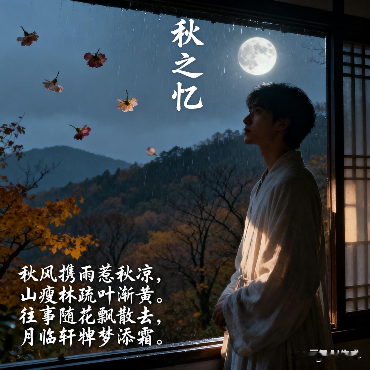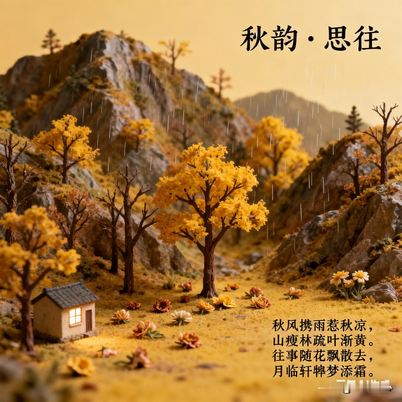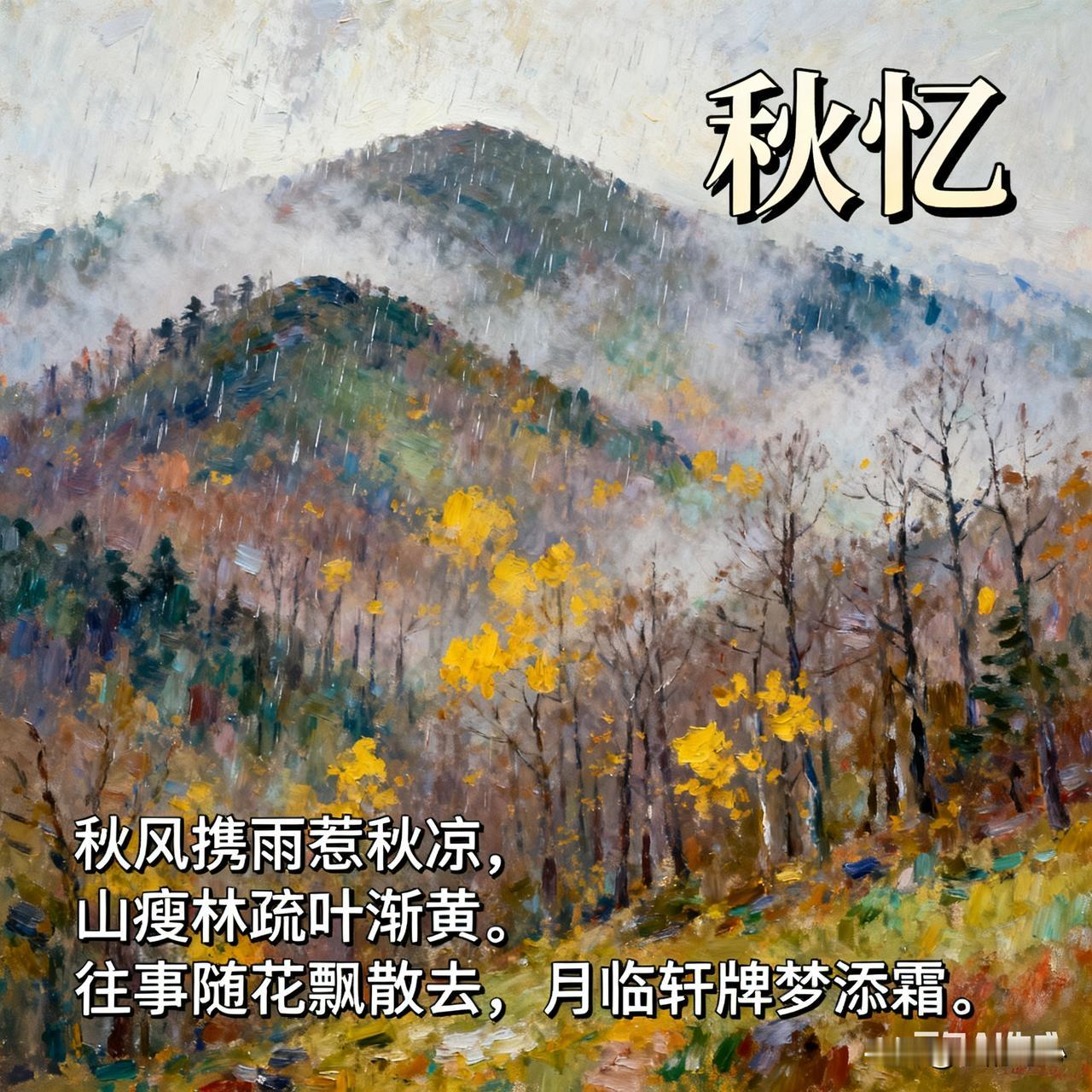 《秋思》乐韵诗心原创: 秋风携雨惹秋凉,山瘦林疏叶渐黄。 往事随花飘散去,月临轩牖梦添霜。 这首七言绝句诗的秋思有感 首句“秋风携雨惹秋凉”化用原句意境,点明秋风秋雨带来秋凉之感,“惹”字赋予秋风了秋天里山峦显得萧索、树林稀疏,树叶逐渐变黄的景象,进一步渲染秋的萧瑟。第三句“往事随花飘散去”对应原句“秋花秋事随秋去”,将过往之事比作飘落的秋花,寓意着过去的事情都随秋渐渐消逝。尾句“月临轩牖梦添霜”,明月照在窗户上,给梦境都添上了一层寒霜,形象地表达出在秋夜中,诗人内心的孤寂与愁绪,即“秋思”。