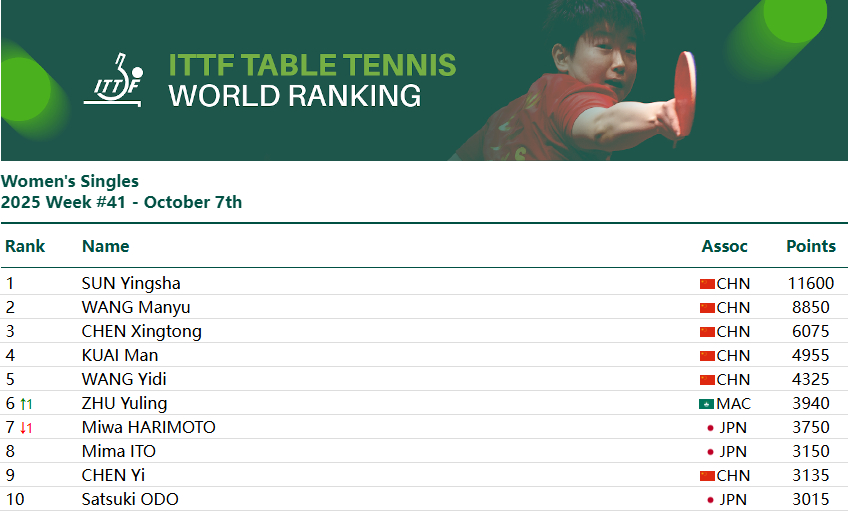 世界乒联公布2025年第41周排名。女单方面,11600分连续第169周霸榜第一,8850分排名第二, 6075分排名第三。
