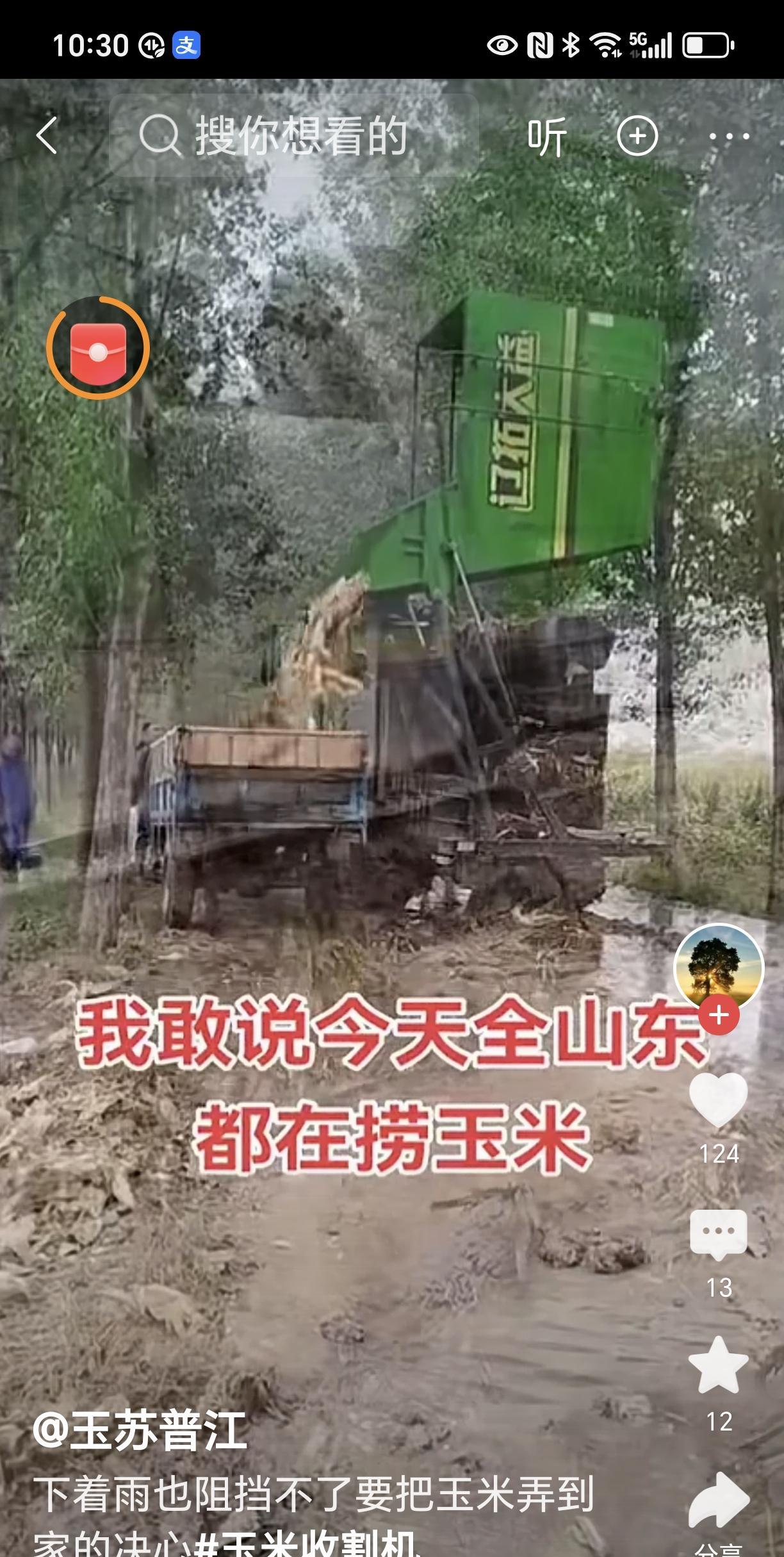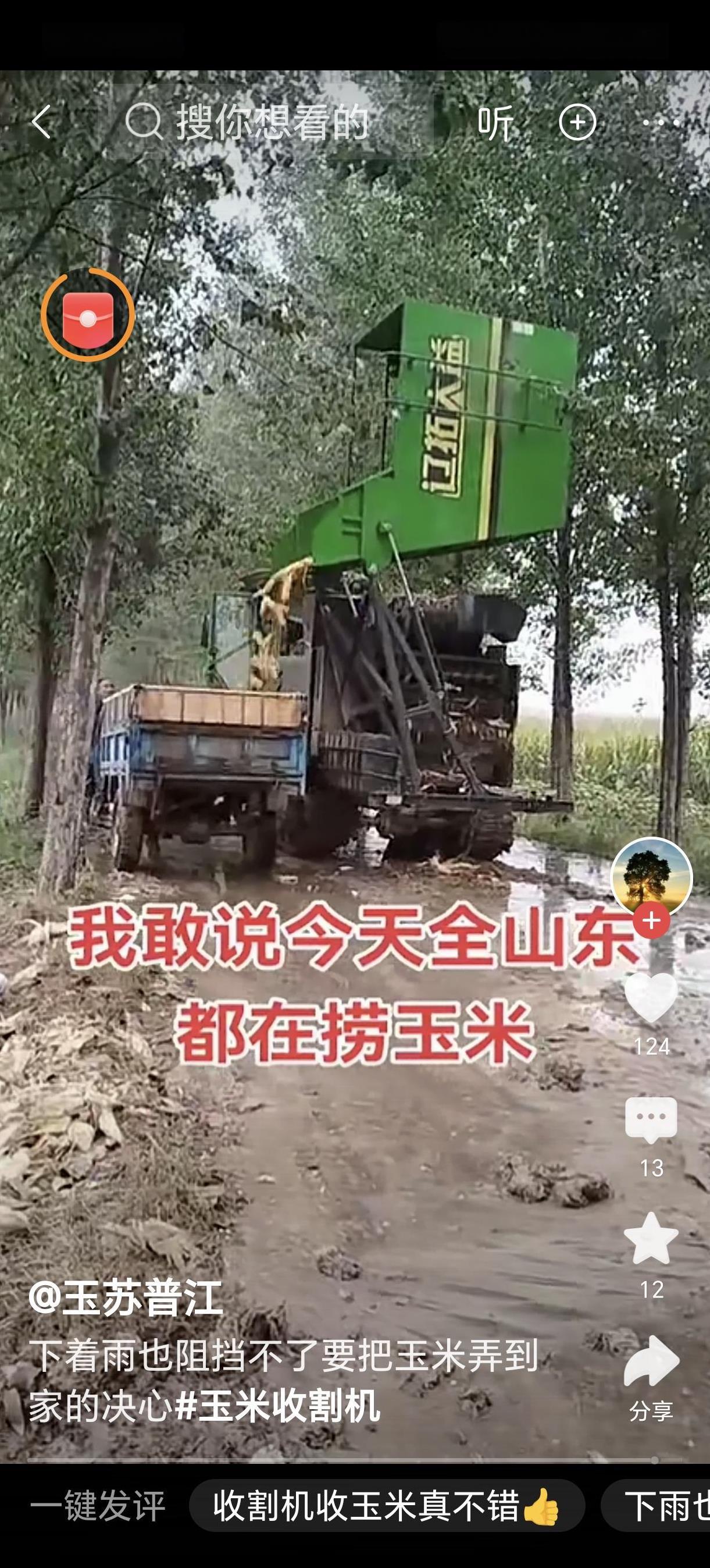 华北地区大面积降雨且持续不断,此时正值秋收玉米抢收的关键期。山东有一台用于收割玉米的联合收割机,它并非轮式,而是传送带式,如同坦克履带一般,能在泥泞道路上行驶。若是轮式收割机,在这样的雨天根本无法前行,会出现打滑的情况。希望这种收玉米的联合收割机能够广泛应用,毕竟河南还有许多玉米正等着这类机子去收割。
