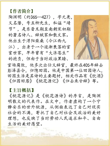 东晋太元年间,武陵郡有个人以打鱼为生。一天,他顺着溪水划船而行,忘记了路程有多远。忽然遇到一片桃花林,生长在溪水的两岸,长达几百步,中间没有别的树木,芳草遍地,新鲜美好,落花纷纷地飘散在地上。渔人对此感到非常惊异。他又向前划行,想要走到林子的尽头。