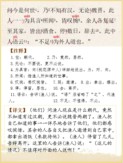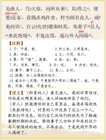 (那里的人)看见渔人,感到非常惊讶,问他是从哪里来的。渔人详细地回答了他们。(有人)就邀请他到自己家里去,备酒杀鸡做饭(来款待他)。村里的人听说来了这么一个人,都来打听消息。他们自己说他们的祖先为了躲避秦朝时期的战乱,带领妻子儿女和乡邻来到这个与人世隔绝的地方,不再出去,于是就同外界的人隔绝了。(他们)问渔人现在是什么朝代,竟然不知道有过汉朝,更不必说魏晋两朝了。渔人把自己知道的事一一详尽地告诉了他们,他们都感叹惋惜。其余的人各自又把渔人邀请到自己家中,都拿出酒饭(来款待他)。(渔人)停留了几天,告辞离开。这里的人告诉(渔人)说:“(这儿的情况)不值得对外面的人说啊!”