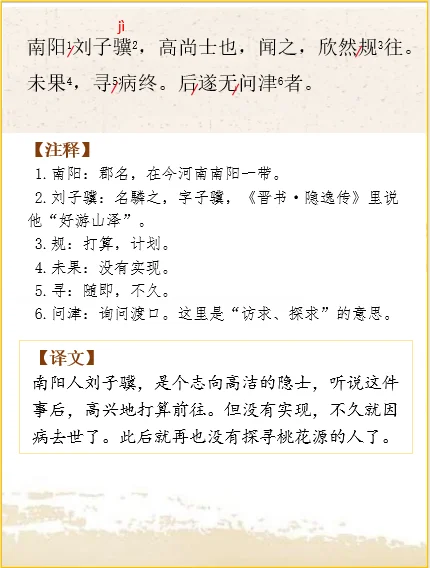 南阳人刘子骥,是个志向高洁的隐士,听说这件事后,高兴地打算前往。但没有实现,不久就因病去世了。此后就再也没有探寻桃花源的人了。