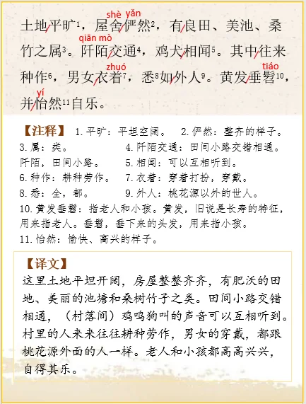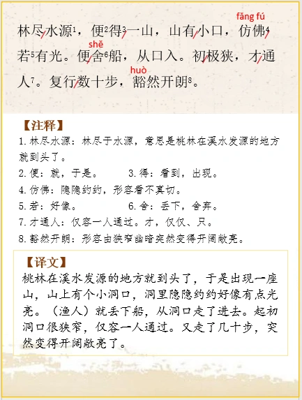 桃林在溪水发源的地方就到头了,于是出现一座山,山上有个小洞口,洞里隐隐约约好像有点光亮。(渔人)就丢下船,从洞口走了进去。起初洞口很狭窄,仅容一人通过。又走了几十步,突然变得开阔敞亮了。这里土地平坦开阔,房屋整整齐齐,有肥沃的田地、美丽的池塘和桑树竹子之类。田间小路交错相通,(村落间)鸡鸣狗叫的声音可以互相听到。村里的人来来往往耕种劳作,男女的穿戴,都跟桃花源外面的人一样。老人和小孩都高高兴兴,自得其乐。