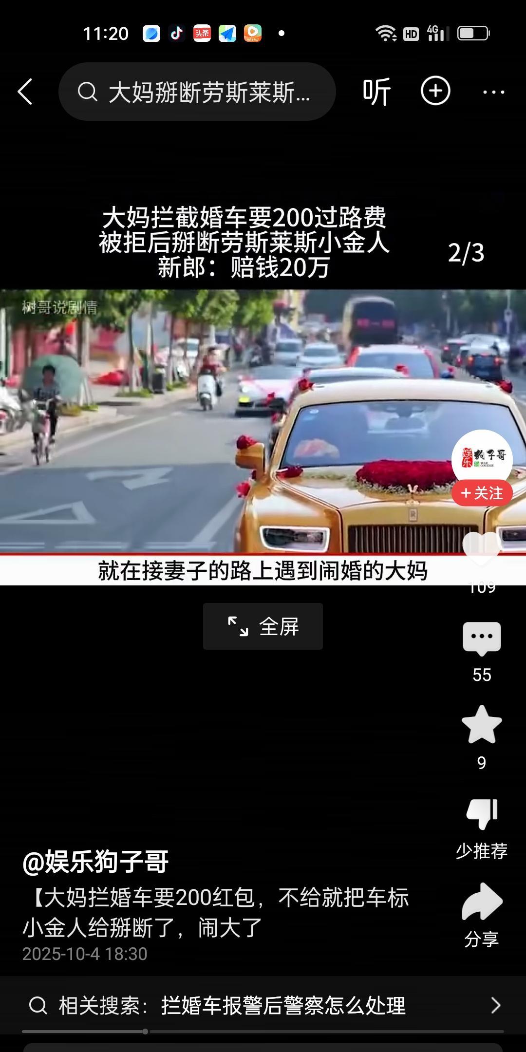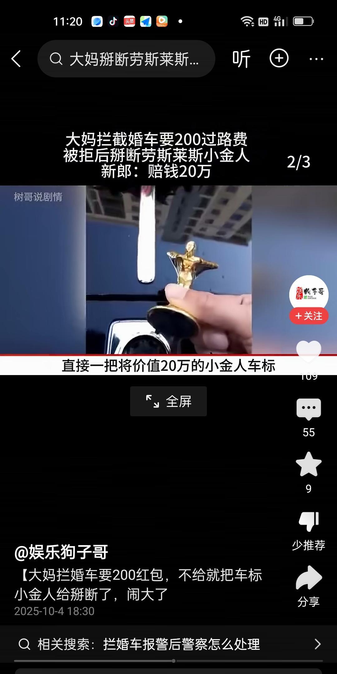 新郎租了一辆劳斯莱斯接亲。中途遇到一位大妈带着一群人拦婚车索要过路费,表示给现场的每一个人发200才可以走。新郎一算100来号人,要20000了,果断拒绝。新郎开车准备离开。大妈直接掰断劳斯莱斯小金人。新郎要大妈赔偿20万,大妈直接瘫倒在地,她怎么也想不到这东西这么值钱。无知者无畏啊,愚昧蛮横惹的祸。