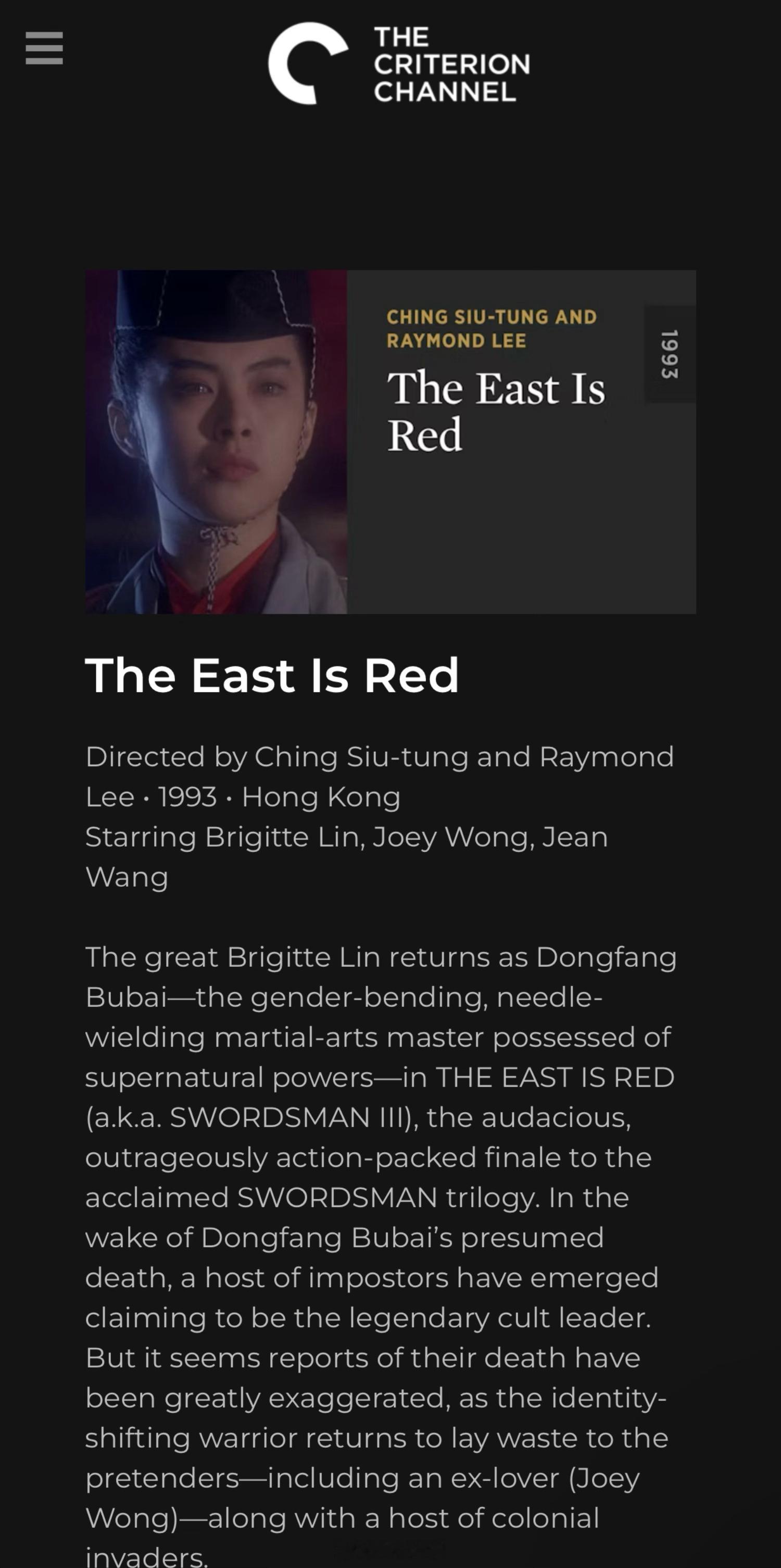 王祖贤[超话]影讯 非常惊喜!没想到,CC标准收藏cc标准收藏 ,居然在其流媒体The Criterion Channel,上线了港片武侠经典许冠杰/叶童【笑傲江湖】+林青霞/李连杰【笑傲江湖2之东方不败】+林青霞/王祖贤【东方不败2之风云再起】三部曲高清修复版![爱慕]好美的雪千寻!王祖贤 这就意味着,“笑傲”三部曲也会和之前【东方三侠】/【现代豪侠传】一样,有机会发行CC标准收藏版蓝光!如果真的发实体,一定买CC!造浪吧国庆档