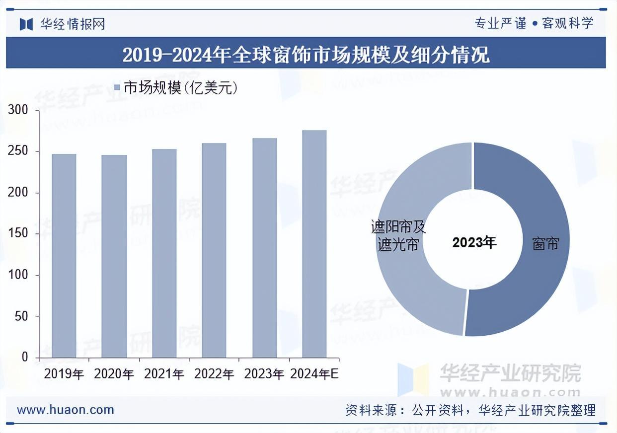 窗饰,即为装饰门窗的饰品,具备光线控制、隔热、隐私及美观多种特质,被广泛用于住宅、商业及工业领域,满足各种窗户类型及尺寸以及客户需求,窗饰产品主要可细分为窗帘以及遮阳帘(遮光帘)。近年,全球经济的持续增长,人们生活水平不断提高,对家居装饰的需求也日益增加,窗饰作为家居软装的重要组成部分,其市场需求随之扩大;2023年,全球窗饰市场规模大约增至267亿美元。