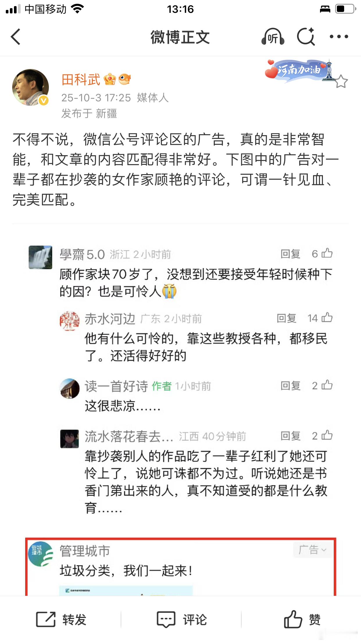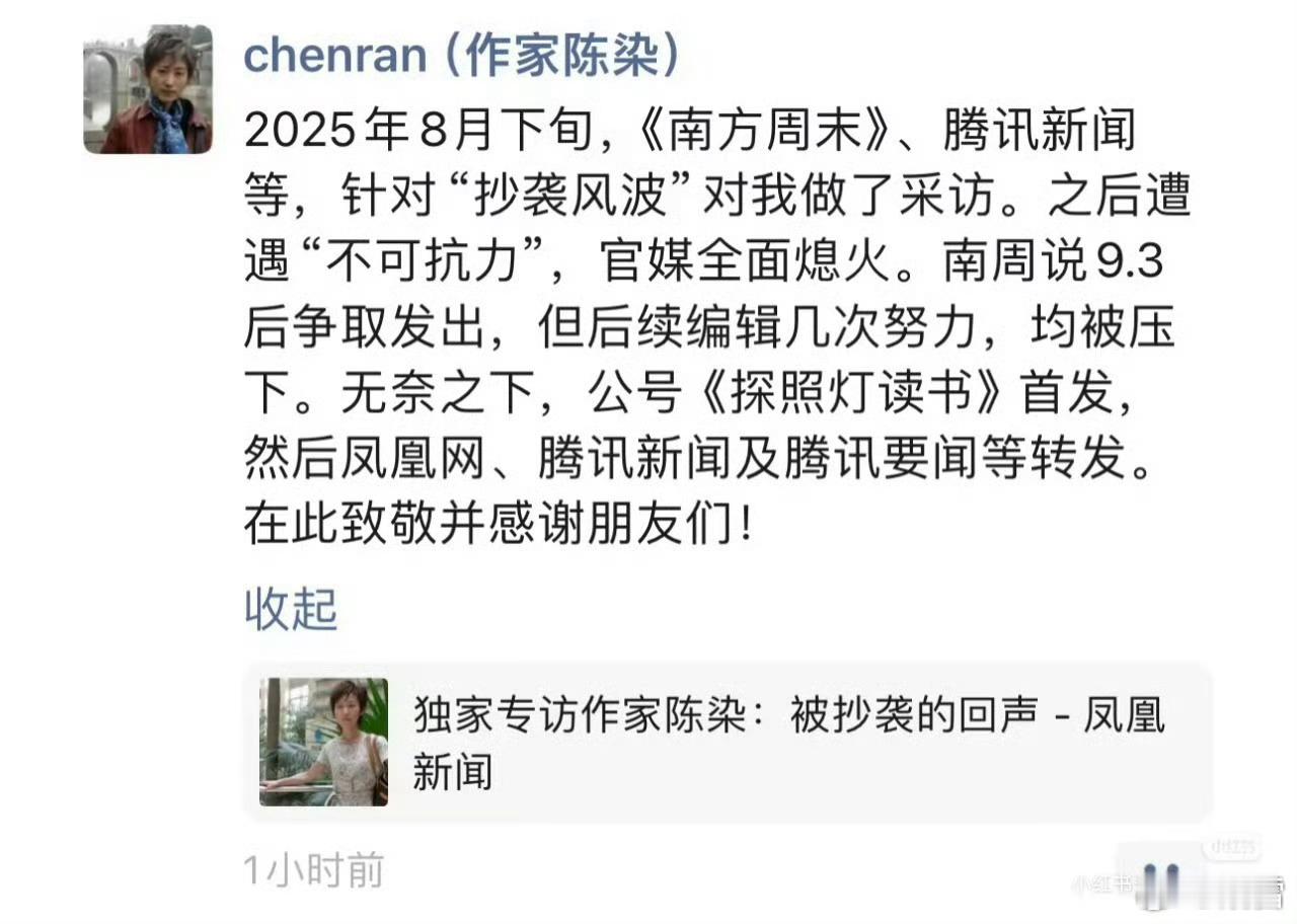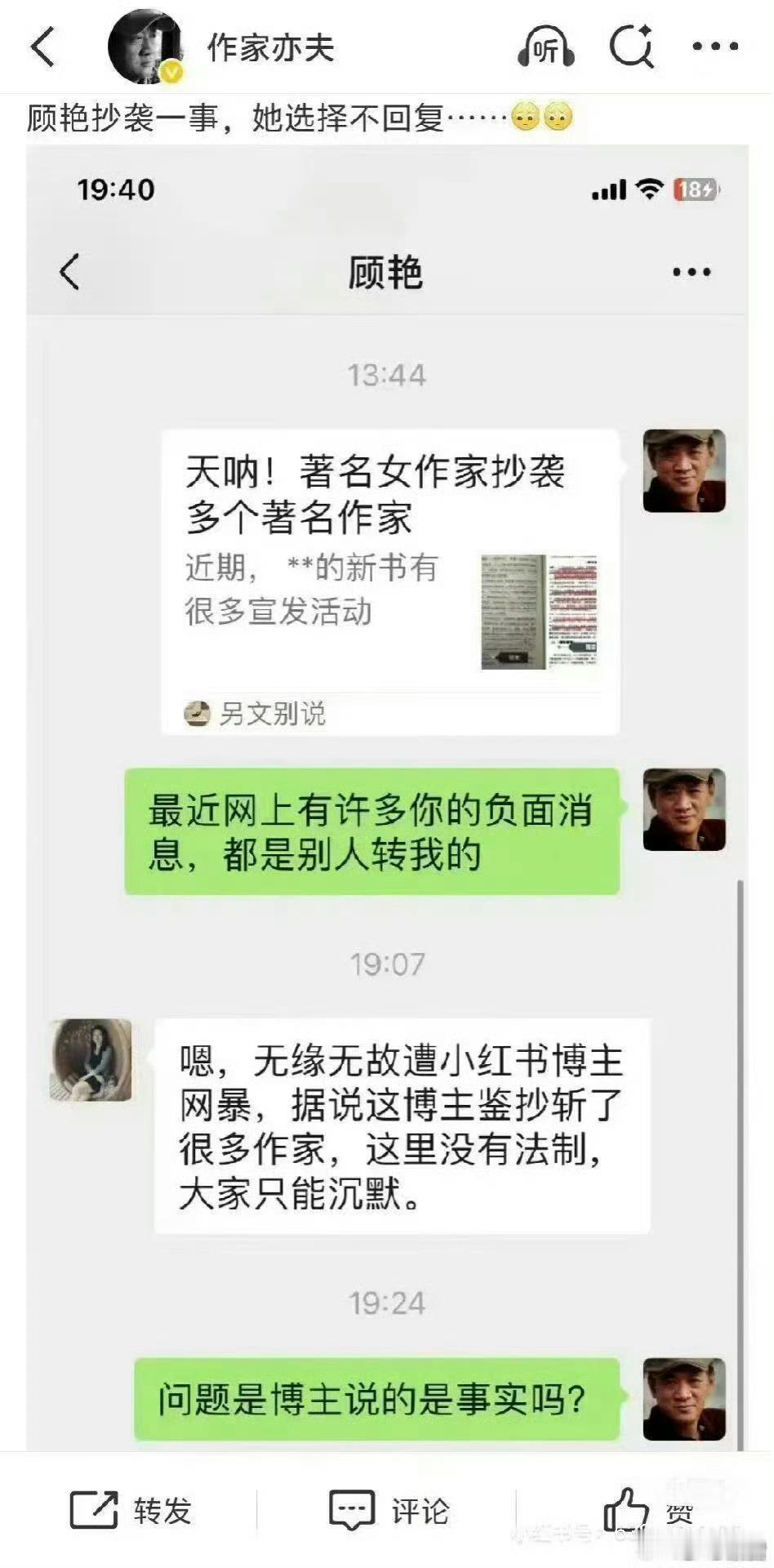 2025年被社交媒体曝光持续抄袭作家陈染,顾艳辟谣的文采,就相当老道,注意看图3,“这个博主鉴抄斩了很多作家,这里没有法制,大家只能沉默”。