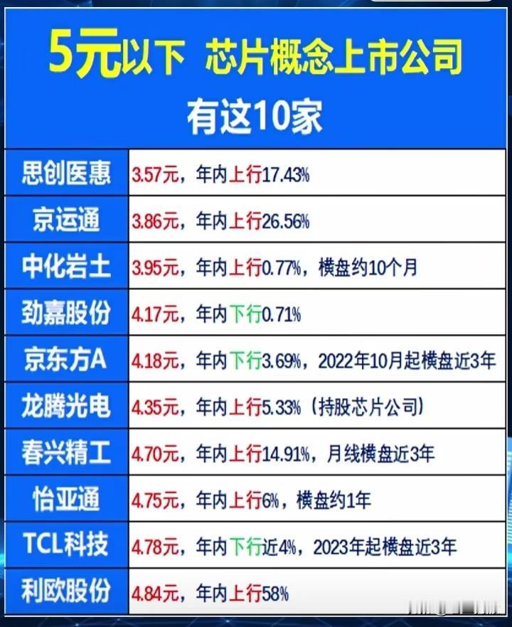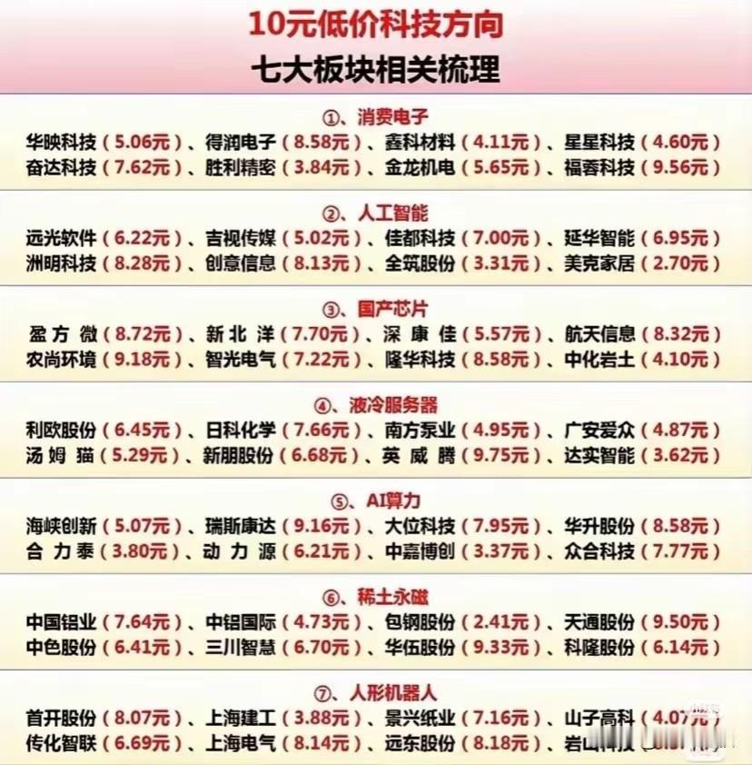 一、5元以下芯片概念上市公司 这是一组股价在5元以下、且与芯片概念相关的A股上市公司,其特点为股价低、部分年内涨幅明显,部分长期横盘。具体如下: 1. 思创医惠:3.57元,年内上涨17.43% 2. 京运通:3.86元,年内上涨26.56% 3. 中化岩土:3.95元,年内上涨0.77%,横盘约10个月 4. 劲嘉股份:4.17元,年内下跌0.71% 5. 京东方A:4.18元,年内下跌3.69%,自2022年10月起横盘近3年 6. 龙腾光电:4.35元,年内上涨5.33%,持股芯片公司 7. 春兴精工:4.70元,年内上涨14.91%,月线横盘近3年 8. 怡亚通:4.75元,年内上涨6%,横盘约1年 9. TCL科技:4.78元,年内下跌近4%,自2023年起横盘近3年 10. 利欧股份:4.84元,年内上涨58% 🔍 关注点: - 多只个股年内表现较好,如思创医惠(+17.43%)、京运通(+26.56%)、利欧股份(+58%)。 - 部分公司明确与芯片产业有关,如龙腾光电(持股芯片公司)。 - 多只个股长期横盘,如京东方A(近3年)、TCL科技(近3年)、春兴精工(近3年月线横盘),可能处于底部盘整阶段。 二、10元低价科技方向 · 七大板块相关公司梳理 ① 消费电子(多只低价股) - 华映科技(5.06元)、得润电子(8.58元)、鑫科材料(4.11元)、星星科技(4.60元)、奋达科技(7.62元)、胜利精密(3.84元)、金龙机电(5.65元)、福春科技(9.56元) ② 人工智能 - 远光软件(6.22元)、吉视传媒(5.02元)、佳都科技(7.00元)、延华智能(6.95元)、洲明科技(8.28元)、创意信息(8.13元)、全筑股份(3.31元)、美克家居(2.70元) ③ 国产芯片(与芯片产业直接相关) - 盈方微(8.72元)、新北洋(7.70元)、深康佳(5.57元)、航天信息(8.32元)、农尚环境(9.18元)、智光电气(7.22元)、隆华科技(8.58元)、中化岩土(4.10元)(也与第一张图重复,属低价芯片概念) ④ 液冷服务器 - 利欧股份(6.45元)、日科化学(7.66元)、南方泵业(4.95元)、广安爱众(4.87元)、汤姆猫(5.29元)、新朋股份(6.68元)、英威腾(9.75元)、达实智能(3.62元) ⑤ AI算力 - 海峡创新(5.07元)、瑞斯康达(9.16元)、大位科技(7.95元)、华升股份(8.58元)、合力泰(3.80元)、动力源(6.21元)、中嘉博创(3.37元)、众合科技(7.77元) ⑥ 稀土永磁 - 中国铝业(7.64元)、中铝国际(4.73元)、包钢股份(2.41元)、天通股份(9.50元)、中色股份(6.41元)、三川智慧(6.70元)、华伍股份(9.33元)、科隆股份(6.14元) ⑦ 人形机器人 - 首开股份(8.07元)、上海建工(3.88元)、景兴纸业(7.16元)、山子高科(4.07元)、传化智联(6.69元)、上海电气(8.14元)、远东股份(8.18元)、岩山科技(8.35元) 🔍 综合观察 & 投资线索 1. 低价特征明显:所有公司股价均在10元或以下,不少在4~5元区间,属于市场中的低价股范畴,对资金量小或偏好低估值的投资者有吸引力。 2. 芯片/科技主题集中: - 第一张图聚焦“5元以下芯片概念”,适合关注半导体、国产替代逻辑的投资者。 - 第二张图按七大科技方向分类,其中国产芯片、AI算力、人工智能、消费电子等均为当前科技热点,具备中长期题材支撑。 3. 部分个股多重概念叠加: - 如中化岩土既属于“5元以下芯片概念”,又出现在“国产芯片板块”中,且股价极低(约4元),值得重点留意。 - 利欧股份同时出现在两个图片中,分别属于“芯片概念”和“液冷服务器/AI应用”领域,显示其业务可能覆盖多个科技方向。 4. 横盘与超跌反弹机会: - 多只个股如京东方A、TCL科技、春兴精工等,已横盘数月甚至数年,若行业基本面回暖,可能存在技术性反弹或估值修复机会。