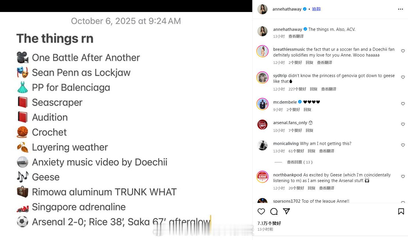 安妮海瑟薇真是个忠实的阿森纳粉丝金秋观赛季中秋元气担当阿森纳著名教授