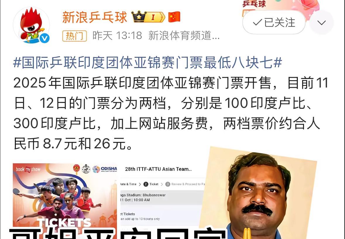国际乒联 印度团体亚锦赛门票最低8块钱 10月11日—15日的亚锦赛门票 已经开始预售中, 最低票价超乎你的想象, 8块钱! 孙颖莎 王楚钦 王曼昱 林诗栋等 国乒主力将于两天后出发, 张本智和非常敬业, 10月7日已经出发亚锦赛团体, 提前适应场地条件去了! 亚锦赛团体的票价为什么这么低, 据了解,因举办地的环境影响, 大部分粉丝不再追这届亚锦赛, 即使莎头带头参赛, 举办当地, 乒乓球的文化底蕴并不是很深厚, 老百姓都这项运动不是 非常感兴趣, 导致票价一降再降! 国乒亚锦赛加油, 平安归来就好!