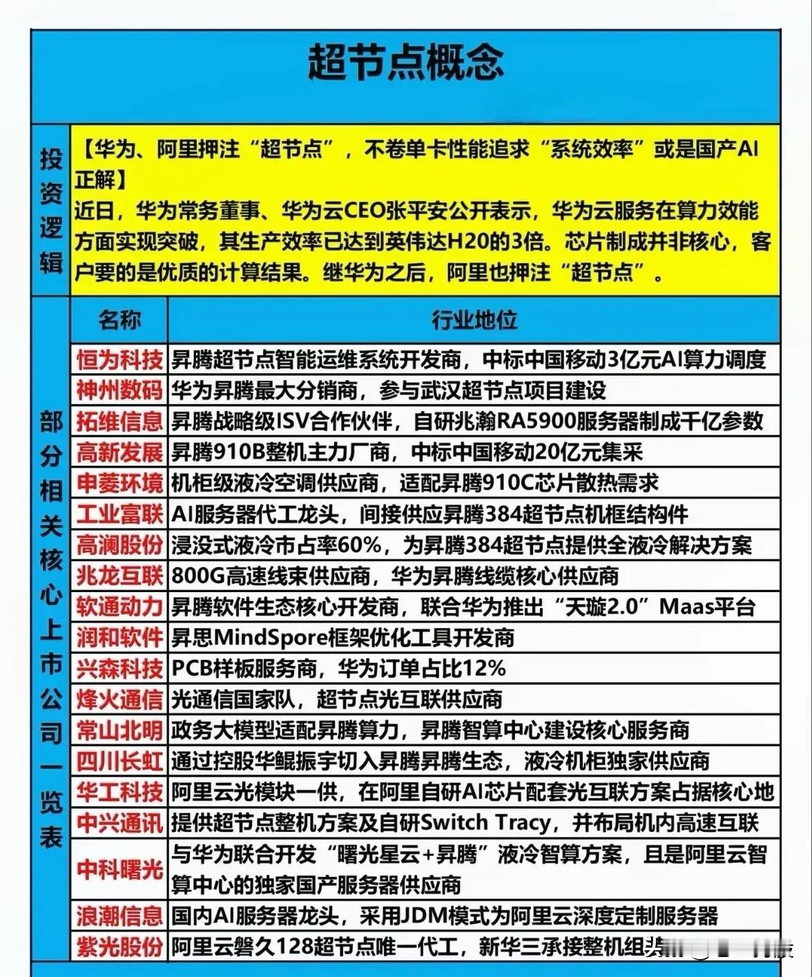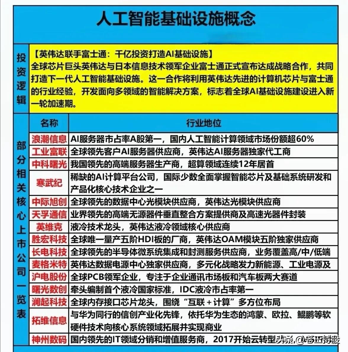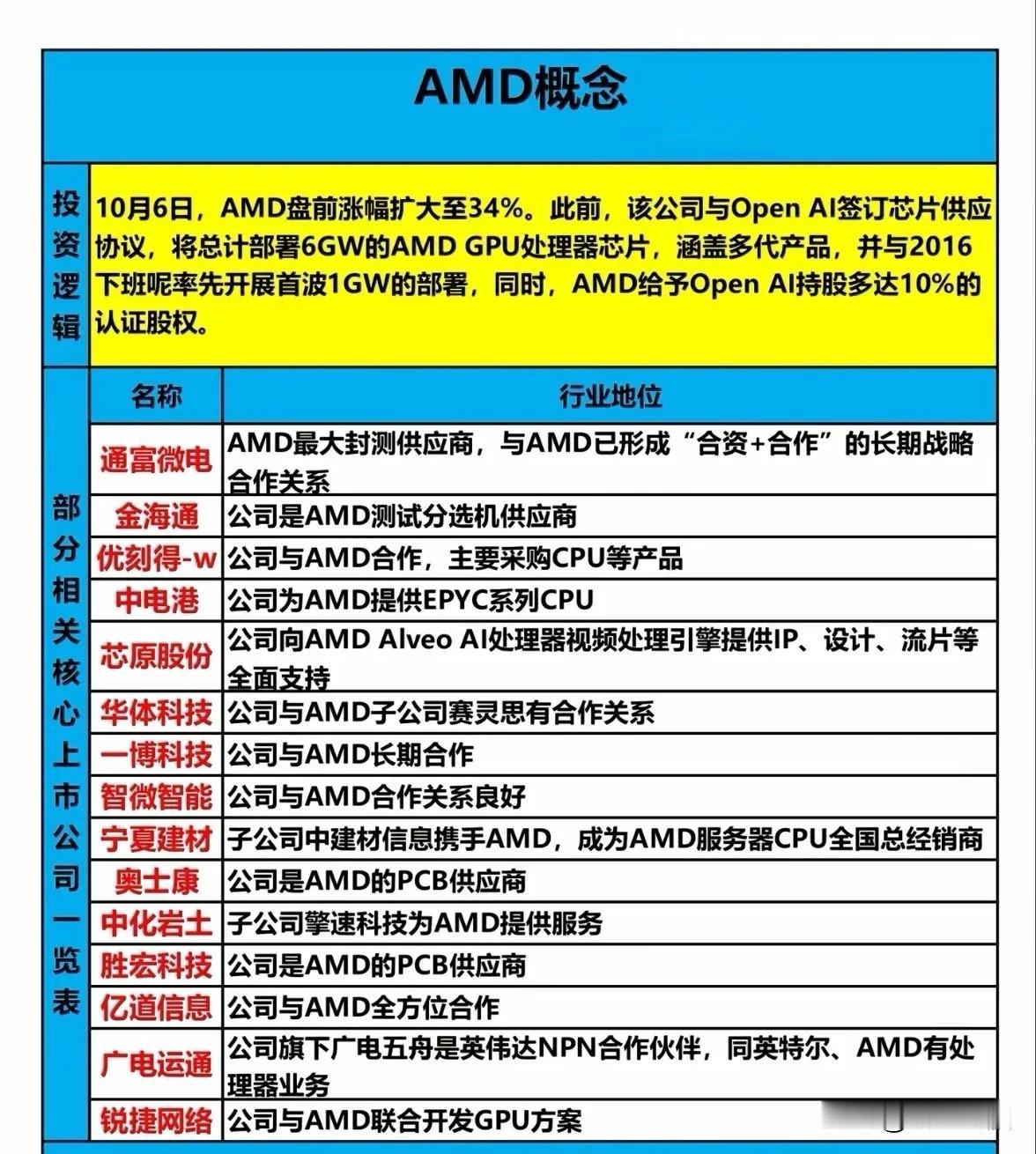 八大AI及新兴科技投资概念股梳理: 一、端侧AI芯片概念 投资逻辑:政策+技术双轮驱动,2026年端侧AI或迎来爆发,AI端侧芯片是未来智能终端(如智能眼镜、耳机等)的核心,产业链价值有望重估。 核心公司举例: - 江波龙、佰微存储、兆易创新(存储芯片,服务AI端侧) - 中科蓝汛、乐鑫科技、恒玄科技、炬芯科技(低功耗SoC,用于音频、穿戴) - 晶晨股份、瑞芯微、全志科技、国芯科技(高性能SoC) - 泰凌微、翱捷科技(连接芯片,用于物联网通信) - 环旭电子、鹏鼎控股(SiP模组/PCB)、润欣科技、芯原股份(模组/IP设计) 二、人工智能基础设施概念 投资逻辑:英伟达与富士通合作打造下一代AI基础设施,全球AI基建进入加速期,涉及服务器、芯片、光模块、液冷、PCB等关键环节。 核心公司举例: - 浪潮信息(AI服务器市占率A股第一) - 工业富联(英伟达AI服务器独家代工) - 中科曙光(超算龙头)、寒武纪(AI芯片平台) - 中际旭创、天孚通信(光模块) - 英维克、胜宏科技、长电科技、沪电股份、曙光数创、澜起科技等(液冷/封装/PCB/互联等) 三、AMD概念 投资逻辑:10月6日AMD盘前大涨34%,因其与Open AI达成芯片供应协议,部署6GW AMD GPU,首波1GW,并授予10%股权。 核心公司举例: - 通富微电(AMD最大封测供应商) - 金海通(测试分选机)、一博科技、芯原股份(长期合作/IP支持) - 华体科技、奥士康、胜宏科技(PCB)、中化岩土、亿道信息等(多领域合作商) 四、超节点概念 投资逻辑:华为、阿里押注“超节点”架构,不卷单卡性能,而是提升整体系统效率,华为云算力已达英伟达H20的3倍。 核心公司举例: - 恒为科技(超节点智能运维,中标中移动大单) - 神州数码(华为昇腾最大分销商,参与武汉超节点) - 拓维信息(自研千亿参数服务器) - 高新发展、申菱环境、工业富联、高澜股份、软通动力、润和软件、兴森科技、烽火通信、常山北明、四川长虹、华工科技、中兴通讯、中科曙光、浪潮信息、紫光股份等(覆盖液冷、服务器、光模块、软件生态等) 五、存储芯片三巨头概念(SK海力士/三星/美光) 投资逻辑:摩根士丹利预测2025-2026年存储行业将迎“超级周期”,Open AI与三星、SK海力士合作,拟投资5000亿美元打造“星际之门”。 核心公司(关联SK海力士): - 雅克科技、香农芯创、太极实业、雅创电子、亚威股份、新莱应材、至纯科技、赛腾股份、聚辰股份、德明利、江丰电子、华特气体、兴发集团、正帆科技、联瑞科技等(材料/设备/代理/封测/气体等)其他相关(三星/美光): - 概伦电子、威尔高、兴森科技、澜起科技、美光科技、浪潮科技等 六、机器人灵巧手概念 投资逻辑:马斯克称特斯拉Optimus人形机器人最难的是“手”,行业聚焦灵巧手研发,涉及柔性传感器、空心杯电机、腱绳材料等核心部件。 核心公司举例: - 晶华新材(柔性触觉传感器电子皮肤) - 鸣志电器(空心杯电机,成本低30%)、拓邦股份(同领域供应商) - 祥源新材、福莱新材(柔性材料) - 汉威科技(电子皮肤触觉反馈)、兆威机电(仿生灵巧手) - 柯力传感(多维力传感器)、同益中、恒辉安防、大业股份、南山智尚、尤夫股份、鼎龙科技、埃夫特-U等(腱绳/材料/传感器) 七、Meta眼镜概念 投资逻辑:苹果暂停Vision Pro项目,转向开发类似Meta的智能眼镜,Meta类智能眼镜成为AI终端新热点。 核心公司举例: - 歌尔股份(MR代工龙头,与Meta合作) - 昆仑万维(子公司与Meta合作XR设备) - 荣期科技(Meta供应商,精密组装设备) - 安洁科技、长信科技、科森科技、硕贝德、致尚科技、伟时电子、隆利科技、恒信东方等(功能器件、显示模组、天线、背光、VR产品等) 总结 上述八大概念覆盖了当前AI产业链最前沿的多个细分方向: - 端侧AI芯片和存储芯片是智能终端的“大脑”与“记忆”; - AI基础设施和超节点是支撑AI算力的“地基”与“系统”; - AMD概念体现全球AI芯片格局变化; - 机器人灵巧手和Meta眼镜则是AI赋能消费终端和人机交互的未来入口。