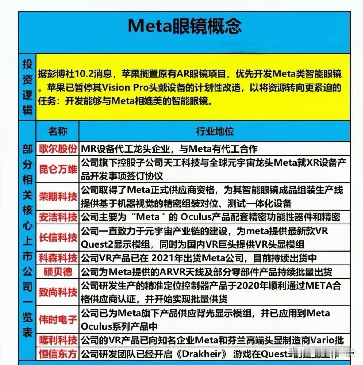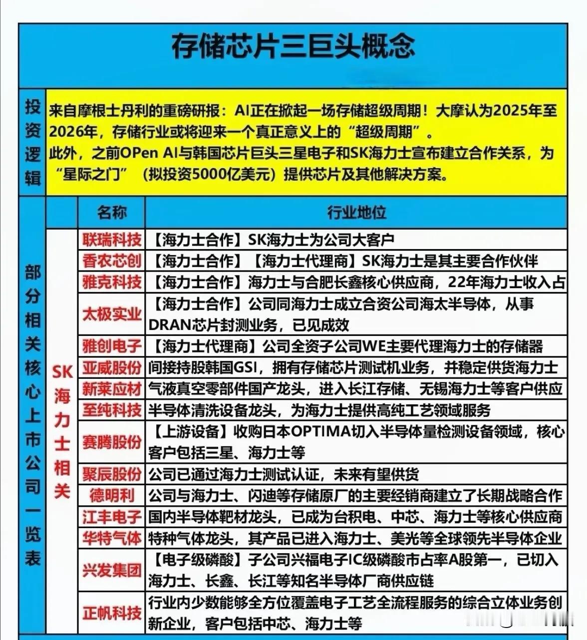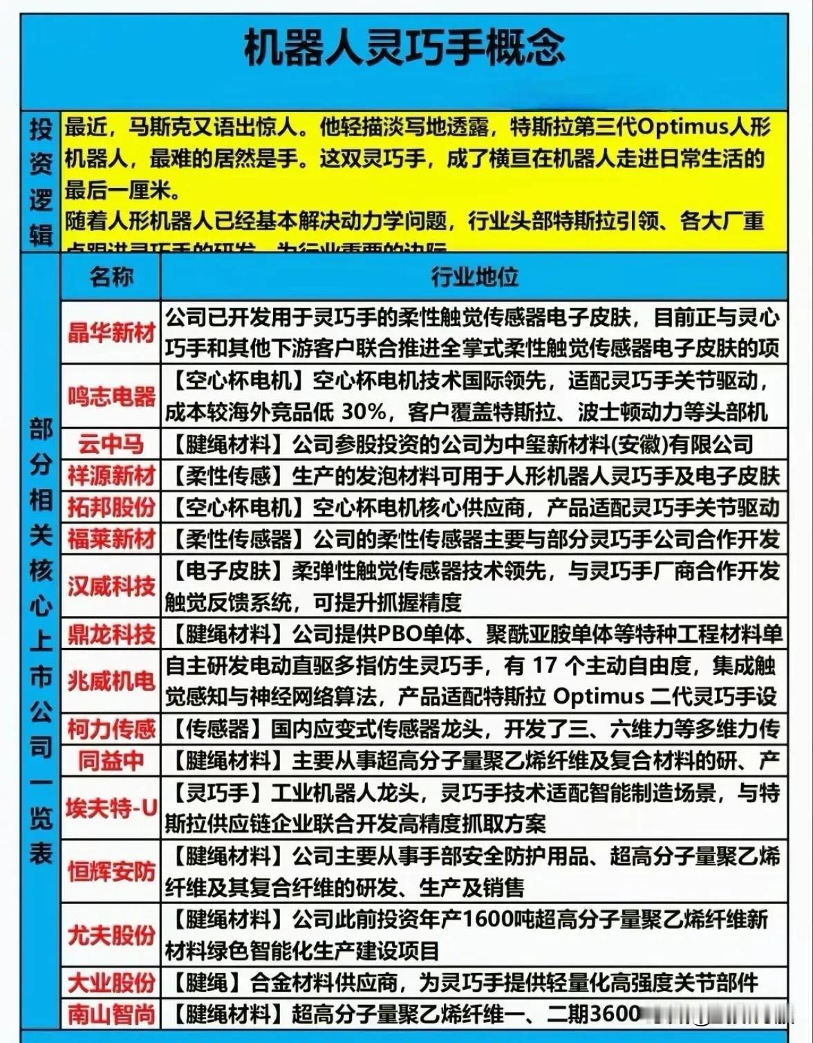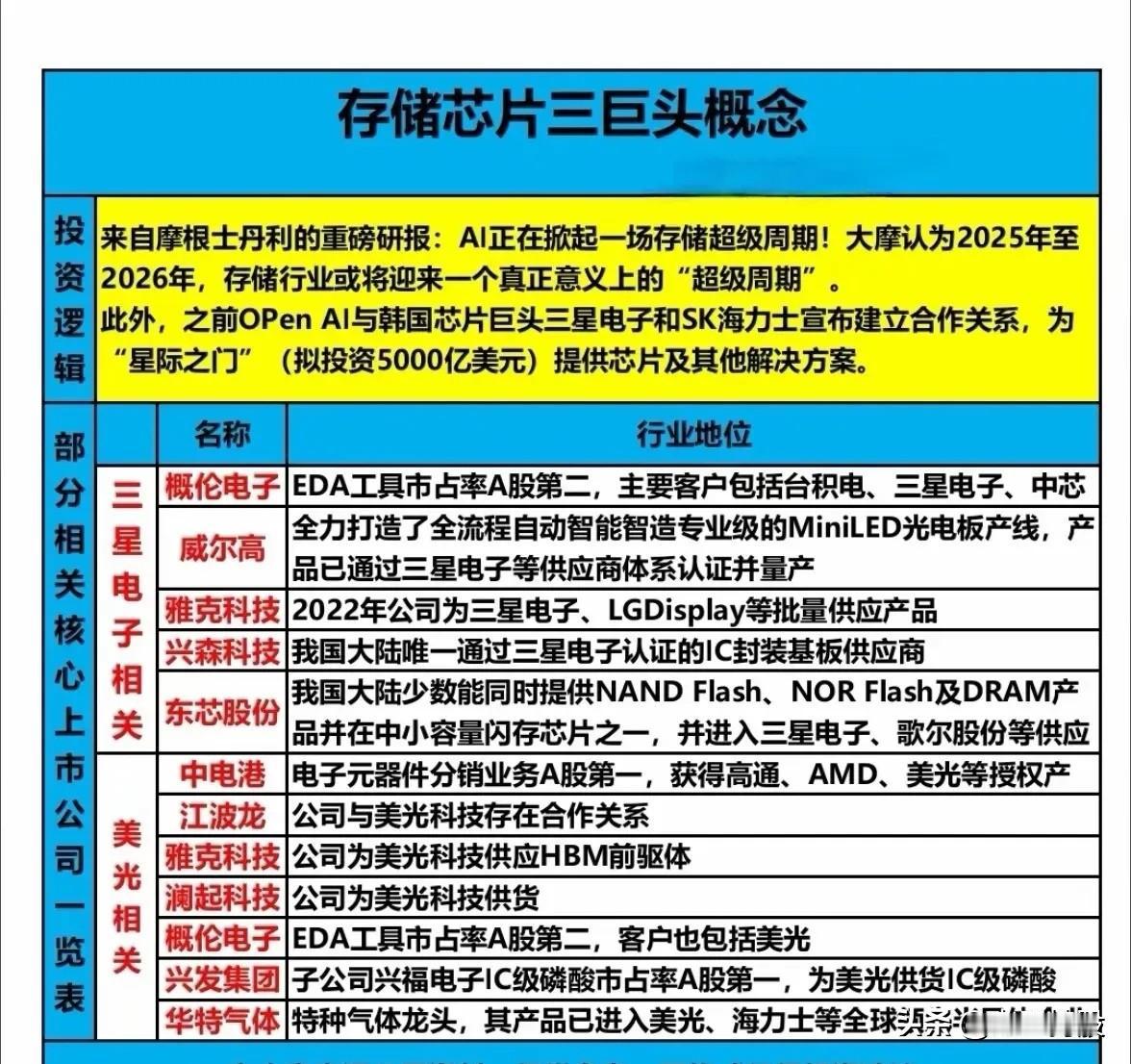 八大AI及新兴科技投资概念股梳理: 一、端侧AI芯片概念 投资逻辑:政策+技术双轮驱动,2026年端侧AI或迎来爆发,AI端侧芯片是未来智能终端(如智能眼镜、耳机等)的核心,产业链价值有望重估。 核心公司举例: - 江波龙、佰微存储、兆易创新(存储芯片,服务AI端侧) - 中科蓝汛、乐鑫科技、恒玄科技、炬芯科技(低功耗SoC,用于音频、穿戴) - 晶晨股份、瑞芯微、全志科技、国芯科技(高性能SoC) - 泰凌微、翱捷科技(连接芯片,用于物联网通信) - 环旭电子、鹏鼎控股(SiP模组/PCB)、润欣科技、芯原股份(模组/IP设计) 二、人工智能基础设施概念 投资逻辑:英伟达与富士通合作打造下一代AI基础设施,全球AI基建进入加速期,涉及服务器、芯片、光模块、液冷、PCB等关键环节。 核心公司举例: - 浪潮信息(AI服务器市占率A股第一) - 工业富联(英伟达AI服务器独家代工) - 中科曙光(超算龙头)、寒武纪(AI芯片平台) - 中际旭创、天孚通信(光模块) - 英维克、胜宏科技、长电科技、沪电股份、曙光数创、澜起科技等(液冷/封装/PCB/互联等) 三、AMD概念 投资逻辑:10月6日AMD盘前大涨34%,因其与Open AI达成芯片供应协议,部署6GW AMD GPU,首波1GW,并授予10%股权。 核心公司举例: - 通富微电(AMD最大封测供应商) - 金海通(测试分选机)、一博科技、芯原股份(长期合作/IP支持) - 华体科技、奥士康、胜宏科技(PCB)、中化岩土、亿道信息等(多领域合作商) 四、超节点概念 投资逻辑:华为、阿里押注“超节点”架构,不卷单卡性能,而是提升整体系统效率,华为云算力已达英伟达H20的3倍。 核心公司举例: - 恒为科技(超节点智能运维,中标中移动大单) - 神州数码(华为昇腾最大分销商,参与武汉超节点) - 拓维信息(自研千亿参数服务器) - 高新发展、申菱环境、工业富联、高澜股份、软通动力、润和软件、兴森科技、烽火通信、常山北明、四川长虹、华工科技、中兴通讯、中科曙光、浪潮信息、紫光股份等(覆盖液冷、服务器、光模块、软件生态等) 五、存储芯片三巨头概念(SK海力士/三星/美光) 投资逻辑:摩根士丹利预测2025-2026年存储行业将迎“超级周期”,Open AI与三星、SK海力士合作,拟投资5000亿美元打造“星际之门”。 核心公司(关联SK海力士): - 雅克科技、香农芯创、太极实业、雅创电子、亚威股份、新莱应材、至纯科技、赛腾股份、聚辰股份、德明利、江丰电子、华特气体、兴发集团、正帆科技、联瑞科技等(材料/设备/代理/封测/气体等)其他相关(三星/美光): - 概伦电子、威尔高、兴森科技、澜起科技、美光科技、浪潮科技等 六、机器人灵巧手概念 投资逻辑:马斯克称特斯拉Optimus人形机器人最难的是“手”,行业聚焦灵巧手研发,涉及柔性传感器、空心杯电机、腱绳材料等核心部件。 核心公司举例: - 晶华新材(柔性触觉传感器电子皮肤) - 鸣志电器(空心杯电机,成本低30%)、拓邦股份(同领域供应商) - 祥源新材、福莱新材(柔性材料) - 汉威科技(电子皮肤触觉反馈)、兆威机电(仿生灵巧手) - 柯力传感(多维力传感器)、同益中、恒辉安防、大业股份、南山智尚、尤夫股份、鼎龙科技、埃夫特-U等(腱绳/材料/传感器) 七、Meta眼镜概念 投资逻辑:苹果暂停Vision Pro项目,转向开发类似Meta的智能眼镜,Meta类智能眼镜成为AI终端新热点。 核心公司举例: - 歌尔股份(MR代工龙头,与Meta合作) - 昆仑万维(子公司与Meta合作XR设备) - 荣期科技(Meta供应商,精密组装设备) - 安洁科技、长信科技、科森科技、硕贝德、致尚科技、伟时电子、隆利科技、恒信东方等(功能器件、显示模组、天线、背光、VR产品等) 总结 上述八大概念覆盖了当前AI产业链最前沿的多个细分方向: - 端侧AI芯片和存储芯片是智能终端的“大脑”与“记忆”; - AI基础设施和超节点是支撑AI算力的“地基”与“系统”; - AMD概念体现全球AI芯片格局变化; - 机器人灵巧手和Meta眼镜则是AI赋能消费终端和人机交互的未来入口。