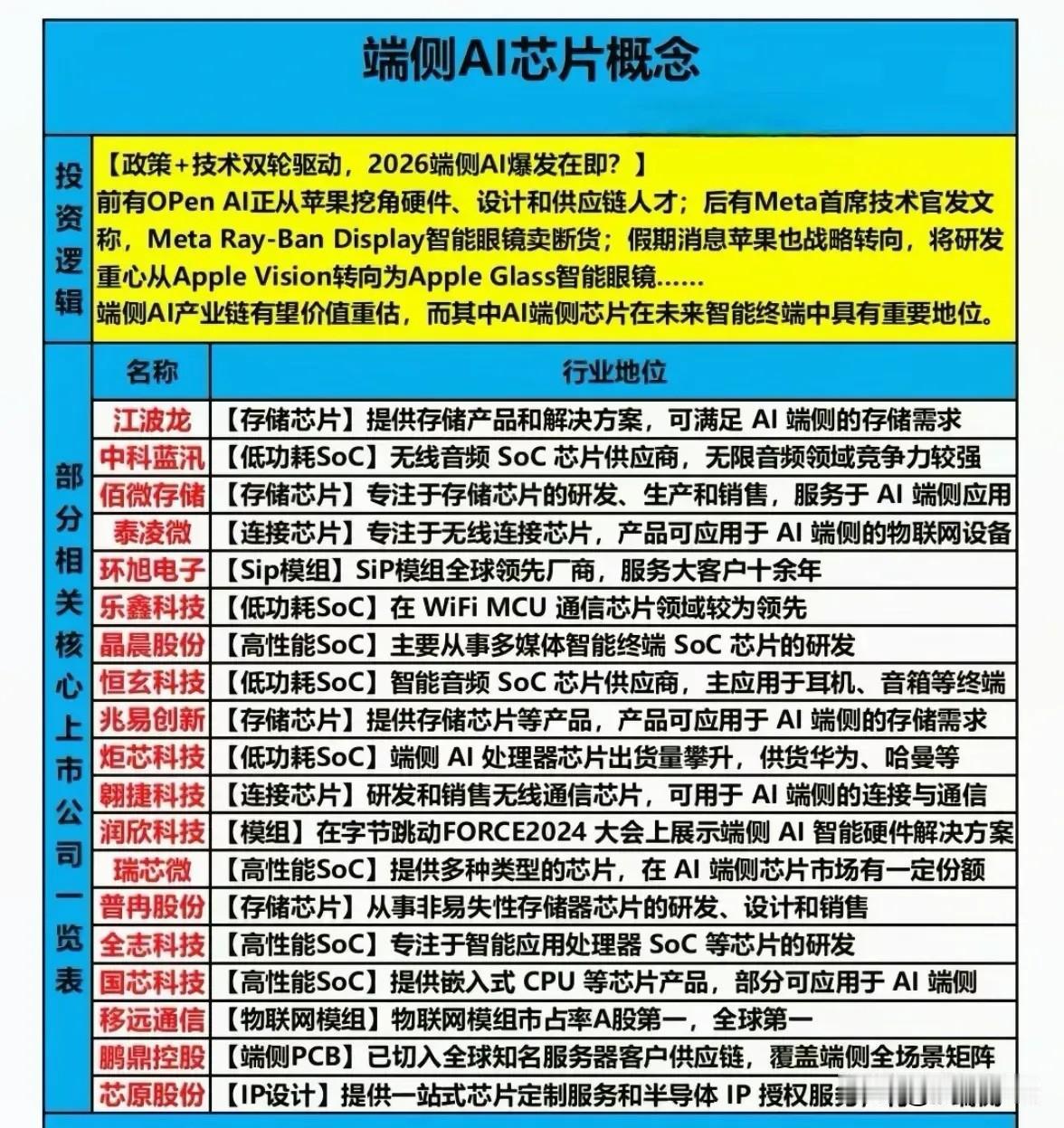 八大AI及新兴科技投资概念股梳理: 一、端侧AI芯片概念 投资逻辑:政策+技