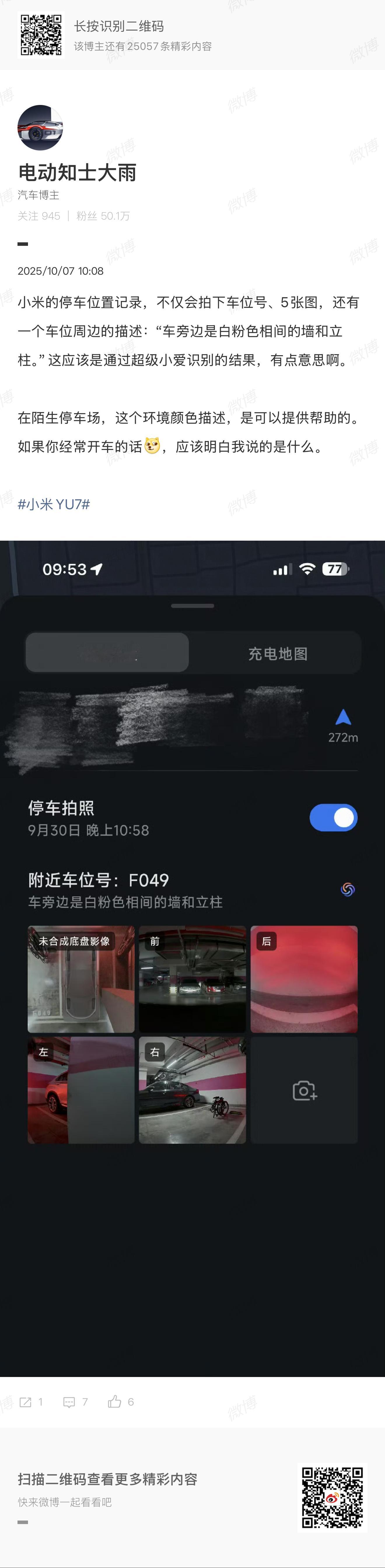 小米YU7 这次还识别了B2层G区,靠近电梯/楼梯口,这车位记录能力确实可以呀[doge]。 ​​​