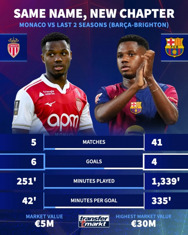 直播吧10月7日讯法蒂今夏从巴萨租借加盟摩纳哥,德国转会市场统计了法蒂过去两个赛季在巴萨、布莱顿的数据,以及本赛季在摩纳哥的数据,做出对比。