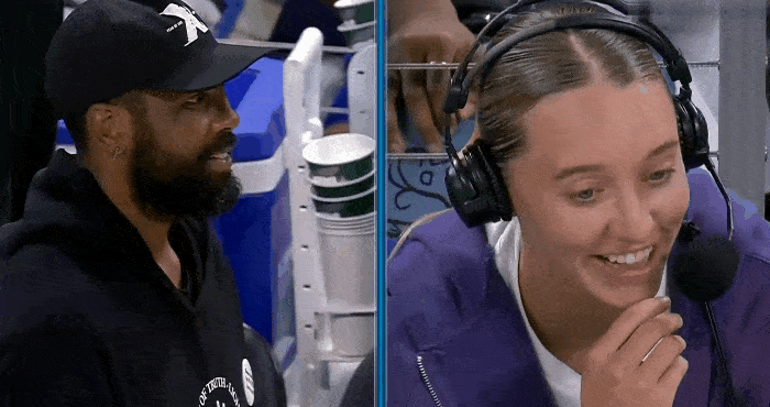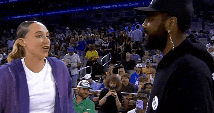达拉斯门面!飞翼状元佩奇-布克斯和凯里-欧文场边愉快交谈