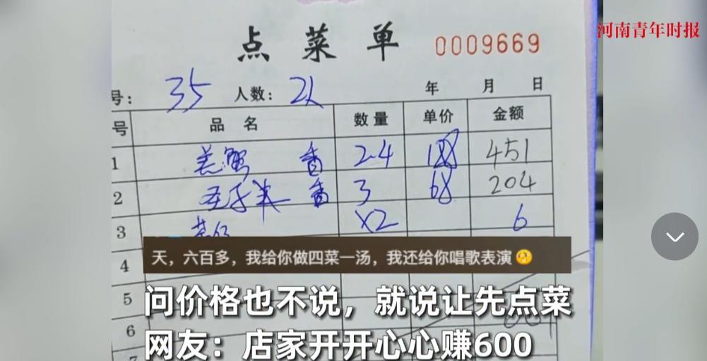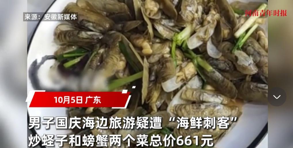“离了个大谱!”10月5日,广东,一男子带家人去海边旅游时去餐馆吃饭,没想到竟然遭遇“海鲜刺客”,他问价格店家只说先品尝,结账时一看炒蛏子和螃蟹两个菜竟然高达661元!网友:店家美滋滋赚600元! 曾经沿海城市海鲜餐馆宰人的事件屡见不鲜,相关部门加大了这方面的整改力度,可即使这样还是有些“黑店”顶风作案,宰起外地游客来毫不手软。 一男子趁着十一假期带家人去海边旅游散心,到了饭点,男子想找个当地特色的海鲜饭馆用餐,怕价格太贵,他还特意在手机上选了一个团购价格比较亲民的馆子。 谁知一家人刚到店,店家就告知团购不能使用,建议单点,男子一想这来都来了,估计单点和团购价格差不了多少,就要了两只螃蟹,点菜期间店家推荐炒蛏子,男子本不想要,可在店家的强力推荐下他还是半推半就要了一份。 点完后男子询问价格表示要先结账,店家却让他们一家品尝完再说,无奈之下,男子只能和家人先吃饭,吃饱喝足后,男子来到前台看账单,没想到这一看他直接傻了眼。 两只螃蟹加上一小盘蛏子,竟然足足要661元!男子虽然也想到过价格会贵,但没想到会这么离谱,细细想来,前面店家一系列的反常行为就是为了留客。 一些网友认为这个价格店家最起码赚600元,确实这家餐馆的定价有些离谱,出门在外吃饭一定要提前问好价格,不要给“海鲜刺客”宰人的机会,如果被宰要及时向相关部门举报,出来旅游谁不想开心游玩,碰上这种店确实糟心! 信息来源:《男子国庆海边旅游疑遭“海鲜刺客”,俩菜661元:不说价格让先吃》安徽新媒体