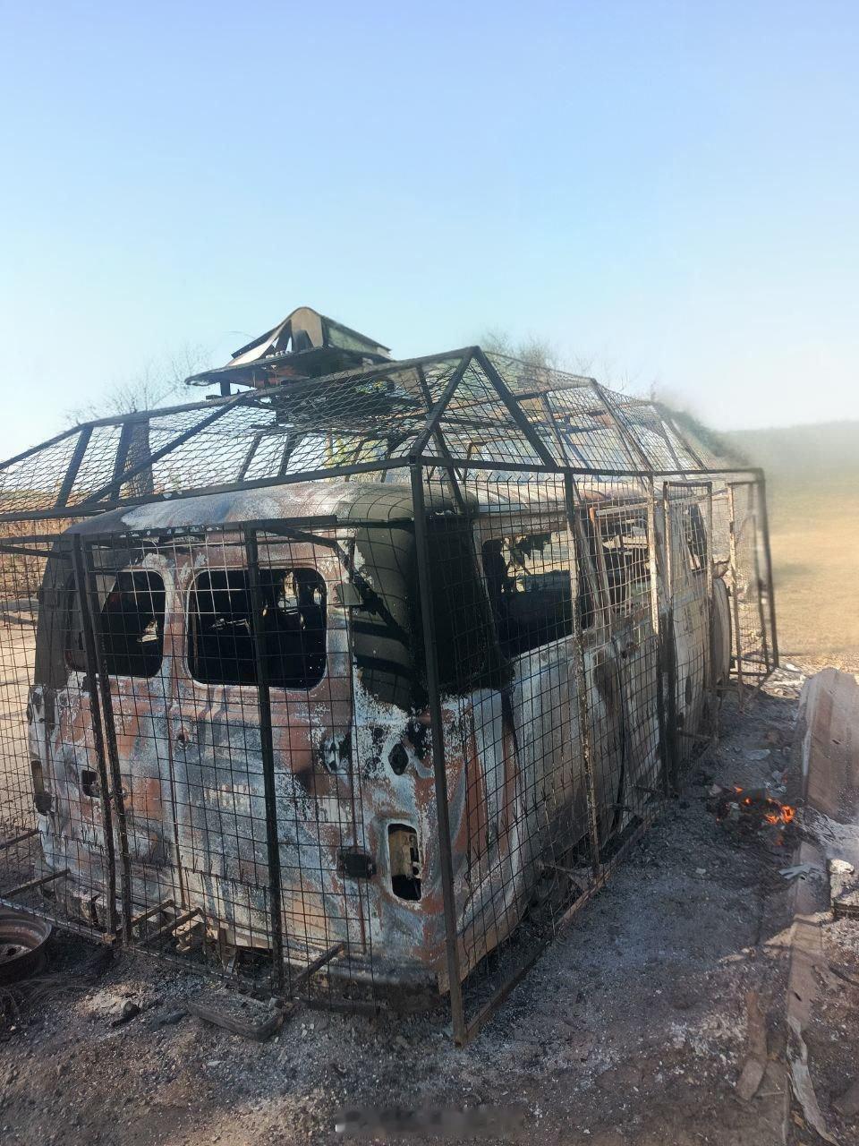 俄军的一辆加棚小巴车被乌军无人机击中后烧毁,不过车上的人跑掉了。
