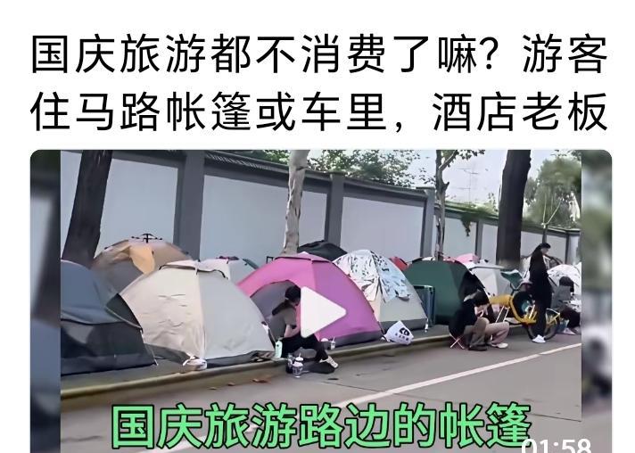 酒店老板哭了,游客不按常理出牌,帐篷排满街头,几千一夜的酒店无人问津,这届年轻人越来越拼了。 假期旅游露宿街头,就是为了省下几个住宿费?还是对逢节必涨的无声抗议?省钱也罢抗议也好,反正这届年轻人彻底变了。 平时200块的经济型酒店国庆敢卖800,三星级从400元直接飙到1500,连青旅的一个床位都敢要300,这吃相难怪年轻人不买账。 这根本不是他们住不起的问题,而是值不值的问题。有位00后说得特别实在:住两晚够我吃半个月火锅,不如花三百买顶帐篷,能住一整个假期。 酒店那些套路年轻人早就一清二楚,什么临时毁约、坐地起价,商家以为拿准了节假日需求旺盛就可以为所欲为,却没想到年轻人直接不陪你玩了。这不是消费降级,分明是“消费清醒”——不盲目追求昂贵,也不刻意省钱,只为值得的体验买单。 所以别怪年轻人不按常理出牌,他们这是懂得把钱花在刀刃上,拒绝当冤大头。酒店老板们要是还抱着节假日捞一票就走的心态,那下次黄金周时街头的帐篷只会多不会少! (每天更新您关心的事,欢迎点赞关注,转发给朋友一起探讨!) 还是年轻人的脑子够用啊,这样才能狠狠治住那些坐地起价的商家。对此大家有什么看法?