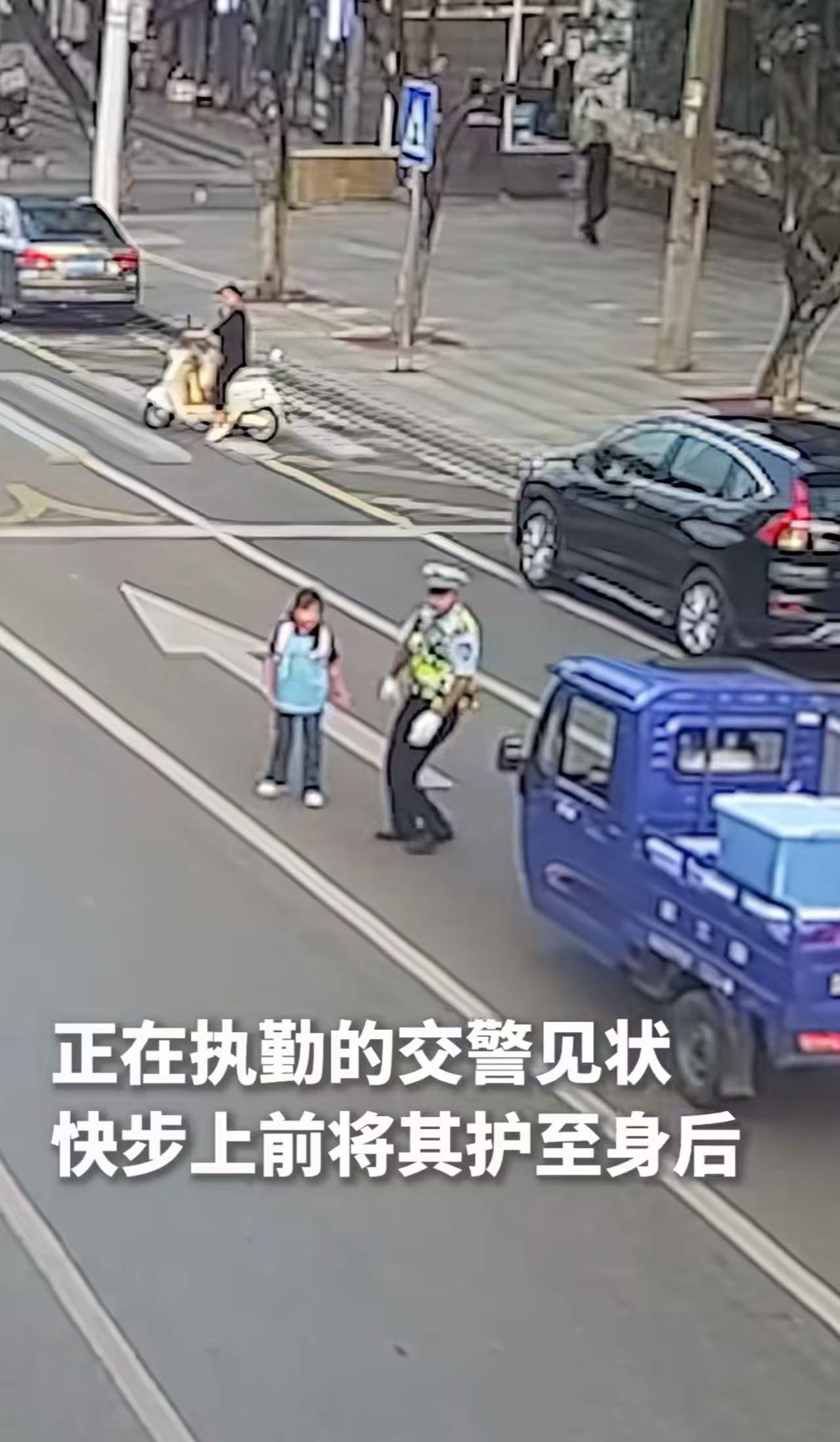 就在这千钧一发之际,正在旁边执勤的交警敏锐地察觉到了危险,飞奔到小女孩的身边,一把将她护到了身后。