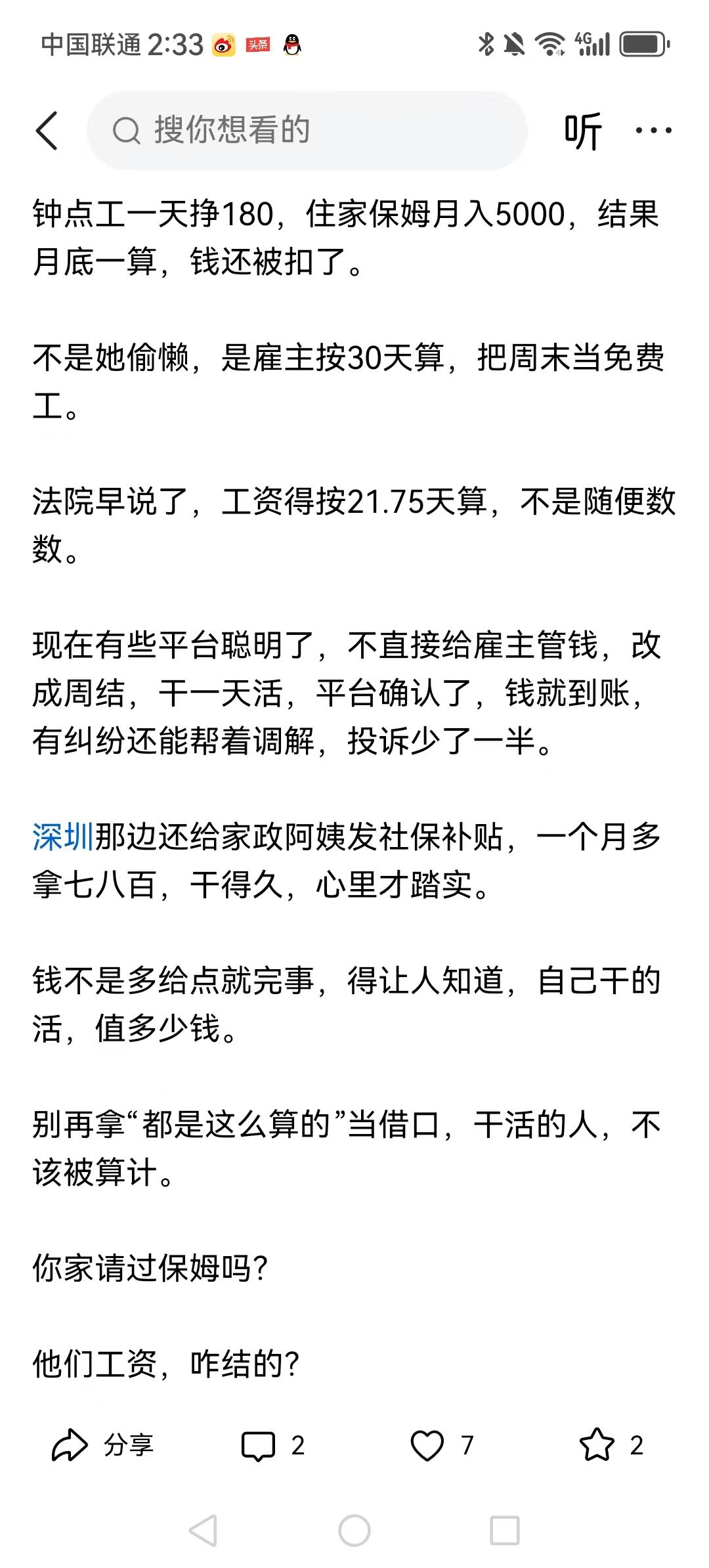 我们这里住家保姆大部分工作时间是26天,保姆有节假日,那請“住家”保姆有什么用,可有可无,不請。用钟点工,有效利用时。 是否要给保姆缴社保,医保,失业保险;保姆在工作中出现伤病,是否按工伤处理;如工作达到一年,是否要休探亲假。 让他们去社会上打听打听私人企业许多是干一天算一天那来加班费,有些国企也不是都给加班费的。 变成泥鳅怕泥雾?保姆也把自己看成公务员了?一两个小时的家政,开口就敢要两三百,此类人贫穷不是没有道理的。