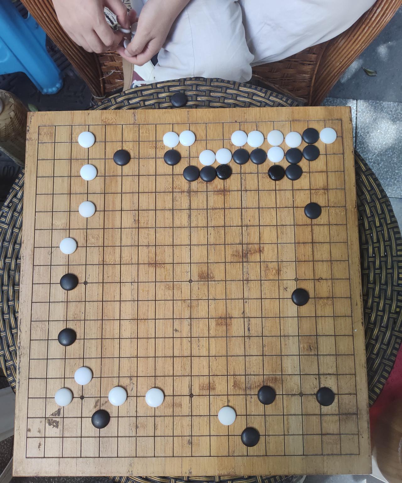 民间对局,邀请你诊断。 如图局面,小编执黑。目前白先。 白棋走哪里比较好?黑棋如何继续扩大右边的模样?白方如何进攻左边黑二子?