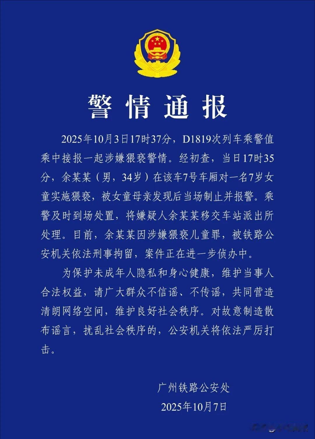 在高铁上对7岁女孩又亲又摸,母亲发现后不原谅坚持报警,男子因涉嫌猥亵儿童罪被刑拘,这下麻烦大了,网友们却有不同看法! 事情发生在10月3日广东的一辆高铁上,因为母女俩没买到连坐,女孩和陌生男子坐在一起,没想到对方一点都不老实,直接上手抚摸,还亲吻女孩的脸,搞得旁边乘客误以为男子是女孩亲戚。 母亲发现女儿被欺负后,当场就火了,厉声质问男子为什么要这样做?得到的回答是:孩子小没关系、她太可爱了。 为了狡辩,男子甚至搬出了家乡习俗,称在他们那里,这样的行为是被允许的。 女孩母亲并不惯着,直接报警解决,10月7日,警方发布通报,34岁陌生男余某,因涉嫌猥亵儿童罪,被依法刑拘! 《刑法》第237条,猥亵儿童的,处5年以下有期徒刑。在公共场所当众猥亵儿童,情节恶劣的,处5年以上有期徒刑。 余某这下是真的惨了,不仅有牢狱之灾,人设崩塌下,家庭、工作和社交都会大受影响。 有网友支持女孩母亲做法,称赞她是好母亲,用法律武器保护女儿,给坏人以应有的惩戒。 不过也有人认为,她有些小题大做了,也许余某的确是因为女孩可爱而激发疼爱,这才有了身体上的接触。 其实这样想是大错特错! 首先,女孩已经7岁,不算特别小,已经是需要男女有别了,作为成年人的余某不可能不懂; 其次,如果是因为可爱而想亲近,那也是长辈对晚辈的那种疼,可以亲亲摸一下头,或者温言细语聊天,不至于各种摸后,还去亲吻脸蛋; 最后,余某和女孩一家素不相识,是完完全全的陌生人,分寸和边界感必须要有,哪有一上来就如此“亲近”的呢,显然是居心不良。 《民法典》中关于收养儿童,其中有条是这样规定的:无配偶者收养异性子女,收养人与被收养人年龄差需在40周岁以上;有配偶者收养子女,需夫妻共同收养。 其实这主要就是防止不诡者,借着收养的幌子,行龌龊之事。 另外,从事发到刑拘中间隔了好几天,相信这个期间警方在各种还原和查证,不冤枉好人,也绝不放过坏人。 因此,余某的辩解苍白无力,被刑拘并不冤枉,希望他能够静思己过,同时也提醒我们所有人要有边界感,要认清法律的底线…… 【关注@小讼言案 ,为您分享更多精彩】 (来源:法治进行时)