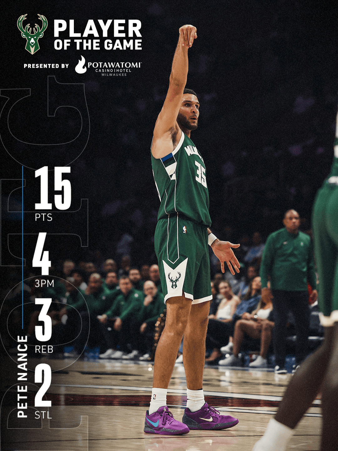 雄鹿官方分享皮特-南斯数据:在17分钟内砍下15分3篮板