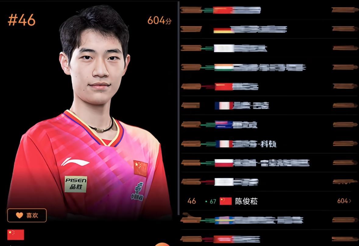 小将陈俊菘一站跃居世界排名50以内——未来国乒主力接班人 陈俊菘在北京大满贯赛事中 一战成名, 从原来的世界排名100多, 一站上升到世界前50名! 有血性的小将, 未来可期! 有冲劲,又非常冷静, 可塑之才! 黄友政,向鹏,陈垣宇的压力来了, 又来一名小将, 还有温瑞博, 看起来也很拼, 就是缺乏稳定性, 本来觉得林诗栋的地位稳稳的, 谁知道越来越多的小将冲击 奥运第三人, 林诗栋继续加油, 一定要顶住小将们的冲击啊……