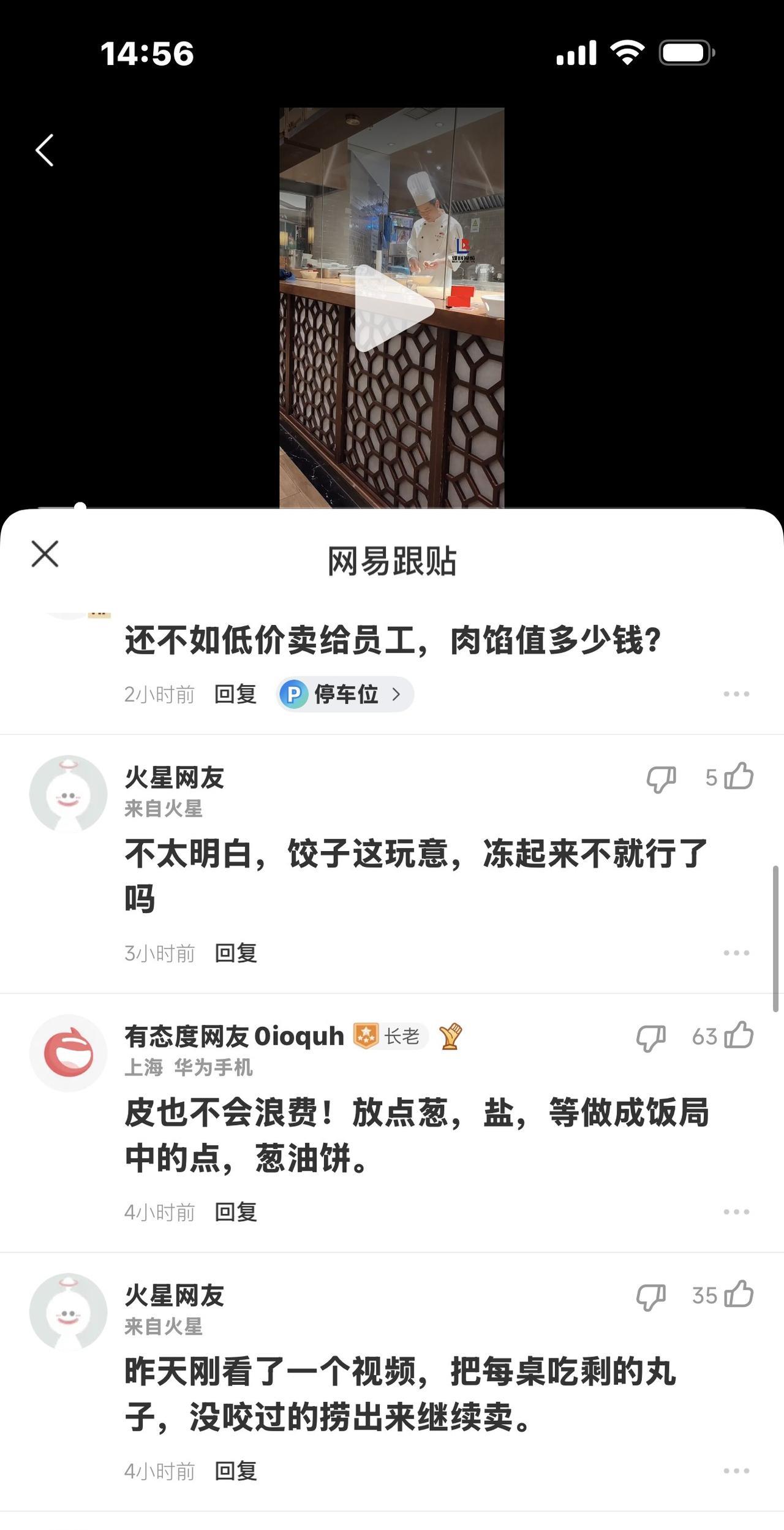 瞧,这位厨师在干坏事吗? 他将包好的饺子一个个拆开,把肉馅弄出来, 饺子皮丢在另一个碗里,这是何用呢? 视频里,这是一家餐厅,装潢看起来不错,厨师穿着专用服装戴着卫生帽,看起来也很正规呀,服装上还有他们的店名,作为一种无声的宣传。 看灯光,好像是到了晚上,顾客应该不多了,但仍然有稀稀落落的身影,在餐桌旁边。 一位30来岁的厨师正在开放式厨房,一丝不苟剥着包好的饺子,把它们一个一个拆开,小心地将肉馅刮出来,集中弄到一个碗里,又将拆出的饺子皮丢在另一个碗里。 别说,干这种事还要有耐心,因为肉和馅粘在一起不好分离,他得小心翼翼刮了又刮。 另一个年轻的厨师在他后面匆匆走过,他侧过脸瞅了一眼,之后两人各忙各的,没有打招呼。 视频作者说,商场餐厅现“谜之操作”:厨师撕掉未售完饺子皮,馅留碗似要再用。 有网友评论: 还不如卖个员工,肉馅值几个钱? 不太明白,饺子这玩意儿,冻起来不就行了吗? 皮也不会浪费!放点葱、盐等做成饭局中的糕点,葱油饼。 昨天刚看了一个视频,把每桌吃剩的丸子,没咬过的捞出来继续卖。 我觉得难以置信,搞不懂,大家说说,这位厨师这么辛辛苦苦把肉馅弄出来,真的是重复利用吗? [泪奔][泪奔]