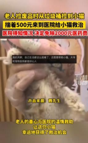 “太有人情味了!”9月30日,山东烟台,一8旬老人捡废品时在垃圾桶发现了一只受伤的小猫,他揣着500元积蓄带小猫来了宠物医院,医院了解到老人的的情况后,直接免除了2000元医药费,网友:善良的人遇到了善良的人! 一些人口口声声说着爱猫,宠物生病时却不管不顾,狠心将其抛弃,而一些人一无所有,却愿意掏出自己的积蓄去救治一只小动物,这就是人与人的差别。 一位八旬老人靠着捡垃圾维持温饱,这天,他在翻垃圾桶时发现了一只受伤的小猫,小猫的眼睛严重受伤,看起来有些吓人,老人将小猫抱在了怀里,到银行将自己500元的积蓄取出,带小猫去宠物医院治病。 老人身上的衣服有些破破烂烂,上面还残留着一些捡废品时沾上的污渍,来到宠物医院后他有些手足无措,将小猫交给医院的医生,小心翼翼询问着治疗的价格,并且告知医生自己只有500元。 医院方面看到了老人的情况后十分感动,即使自己过得这么不容易,老人也愿意拿出积蓄为小猫看病,老人的善心打动了宠物医院,医院免除了小猫所有的医药费,为小猫进行了手术。 不少网友怒赞老人和宠物医院,认为这就是善良的人遇到善良的人,老人需要捡多少垃圾才能攒到500元,可为了给小猫治病他愿意全部拿出,好人终有好报! 信息来源:《老人捡废品时从垃圾桶捡到小猫,揣着500元来到医院给小猫救治,医院得知情况后,决定免除2000元医药费》海峡都市报