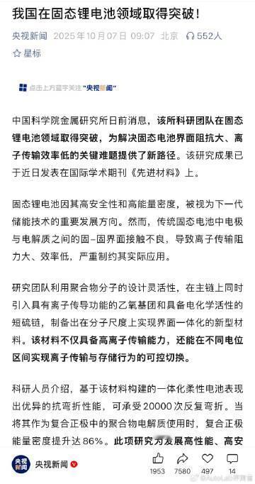 央视发文,固态电池有了新突破【来自懂车帝车友圈】