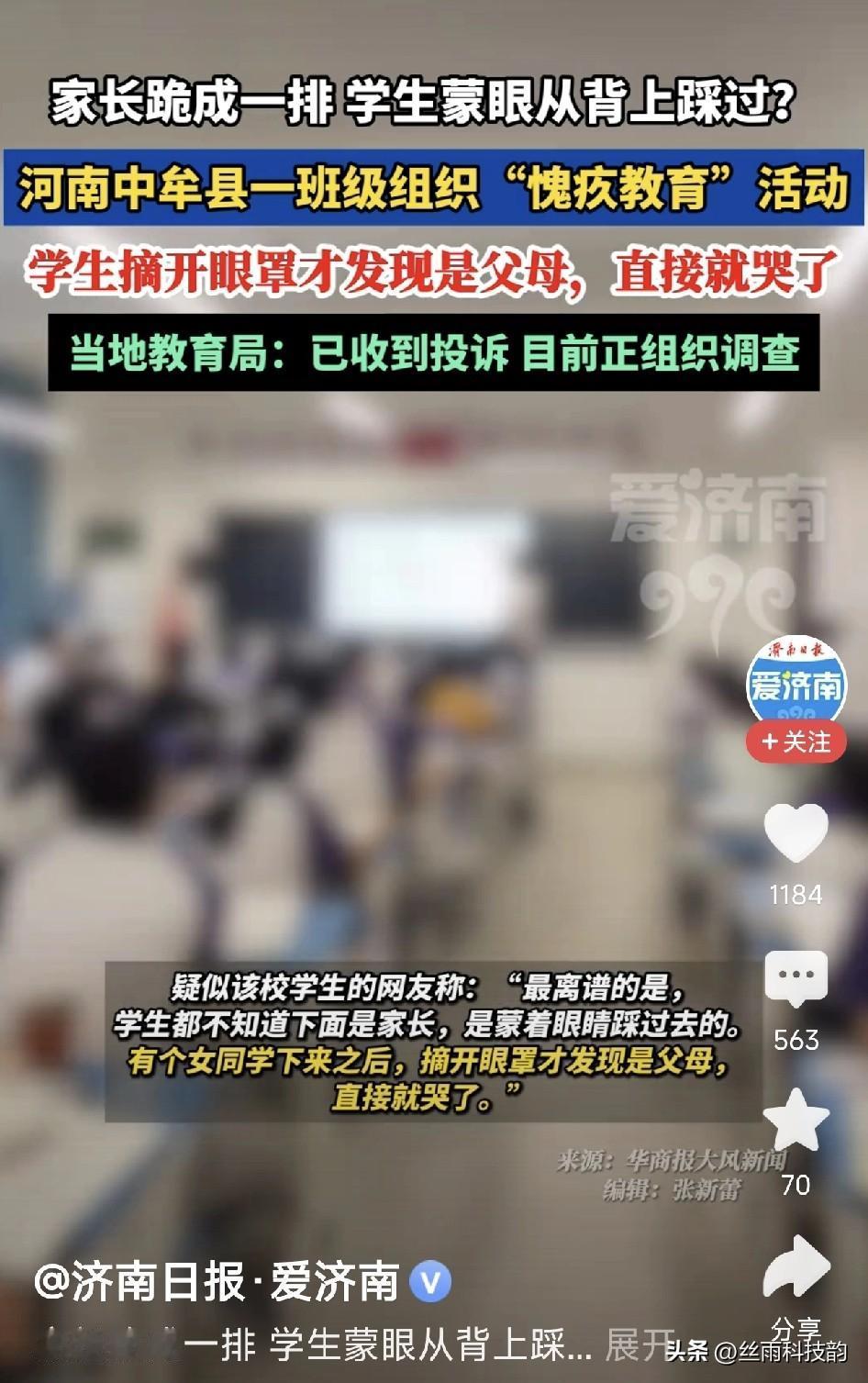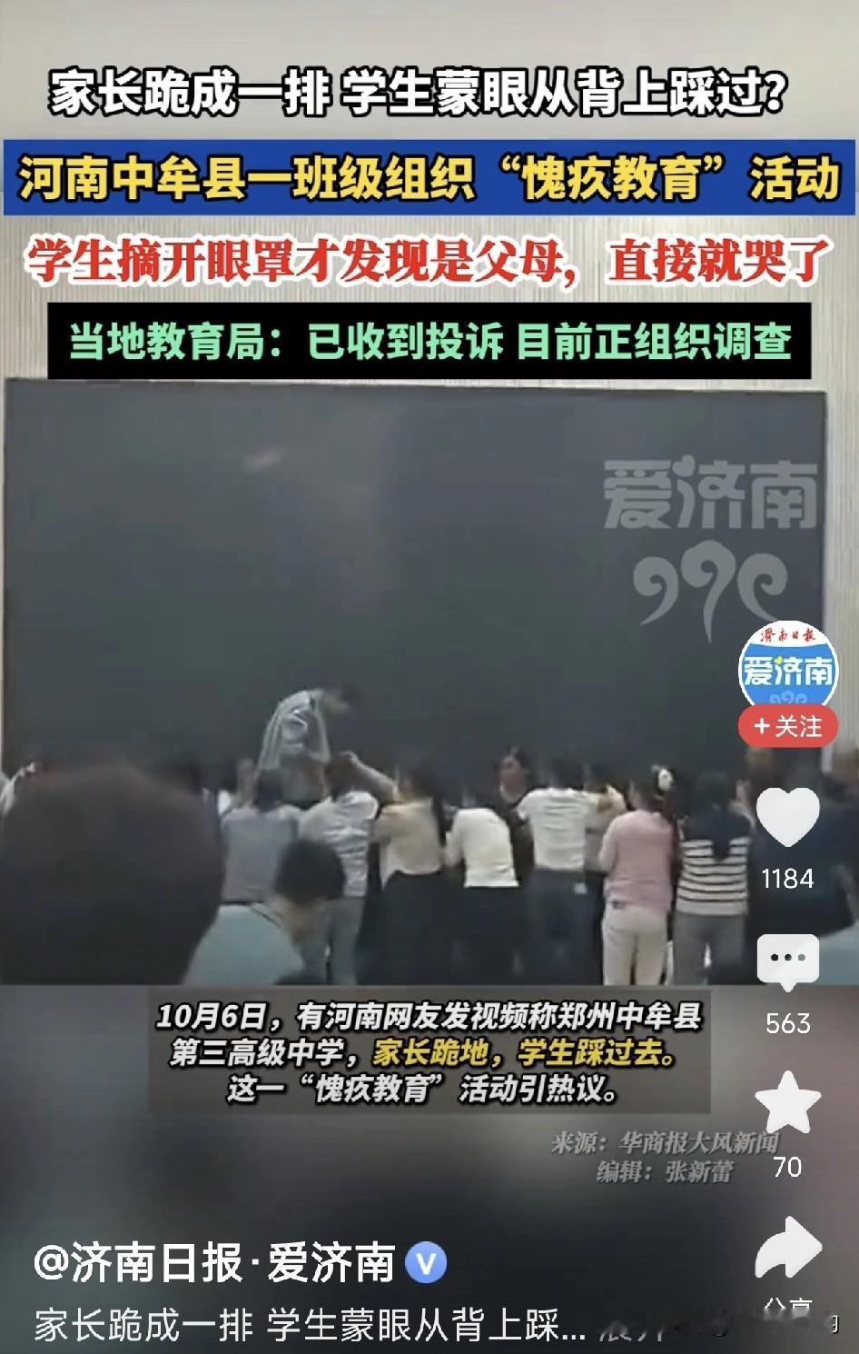 河南中牟县一班级火了!家长跪成一排,孩子蒙着眼从背上踩过去。这种“愧疚教育”活动