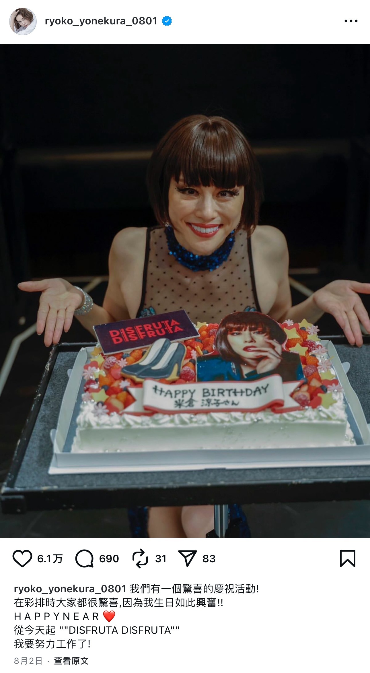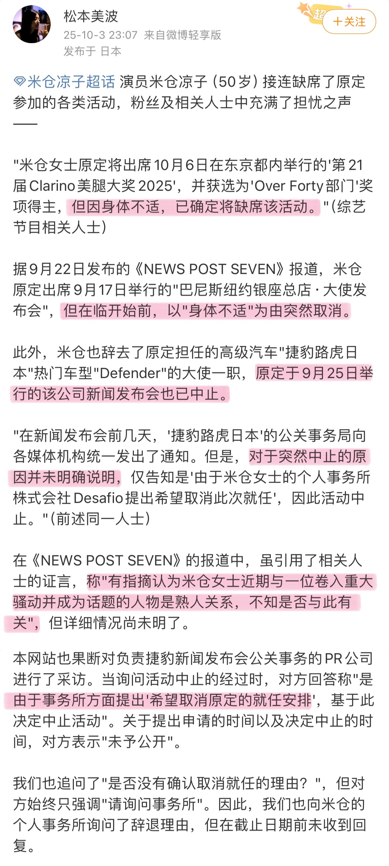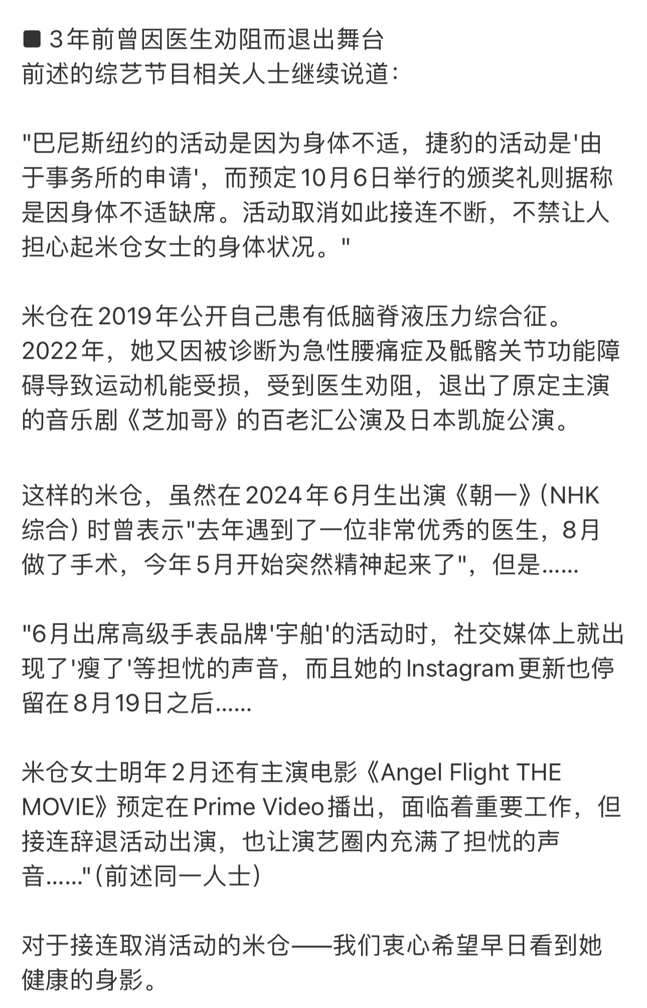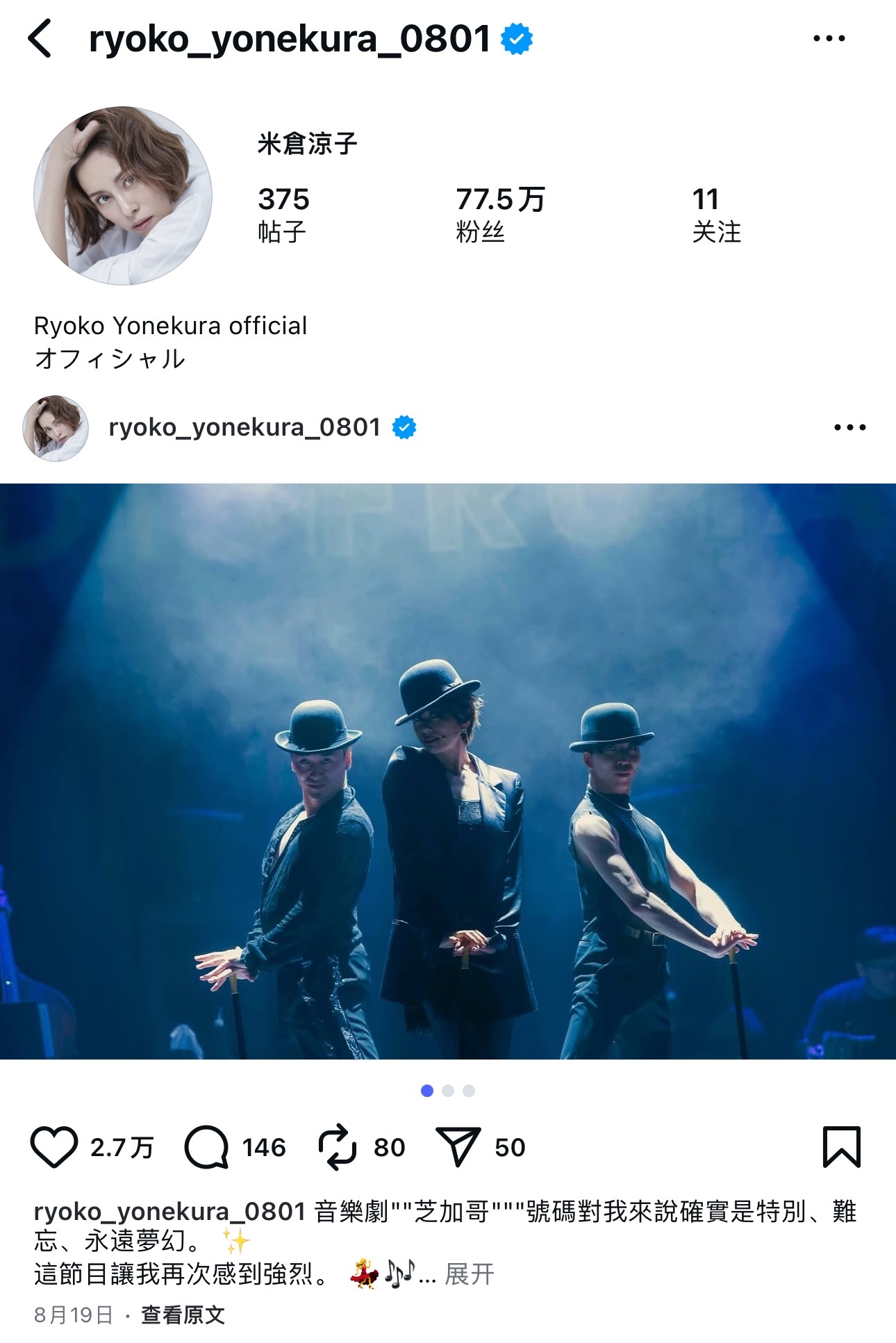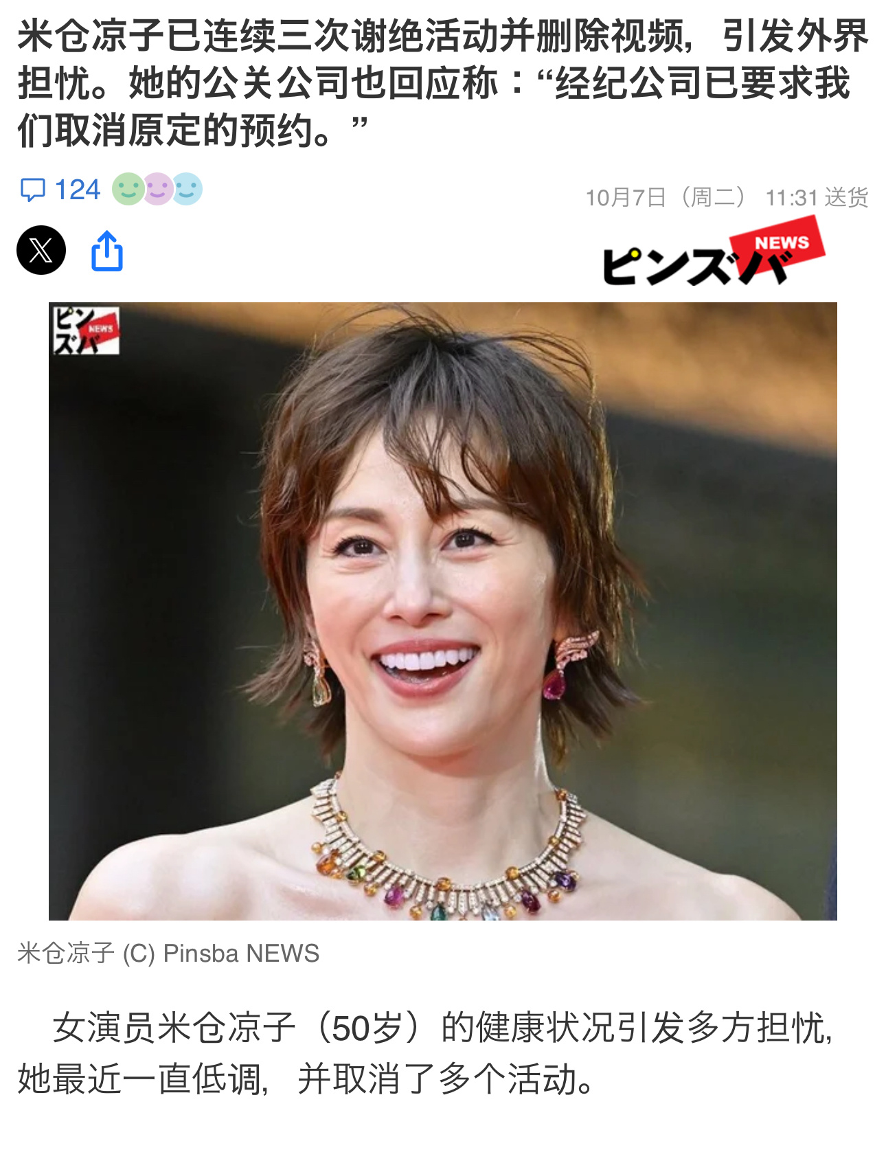 粉丝已经担忧很久了,因为今年8月3日米仓凉子发了50岁庆生照、8月19日更新音乐剧动态后ins账号就停更了。