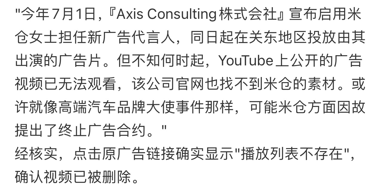 另外她连续三次因为身体原因取消活动,广告视频也被删除。