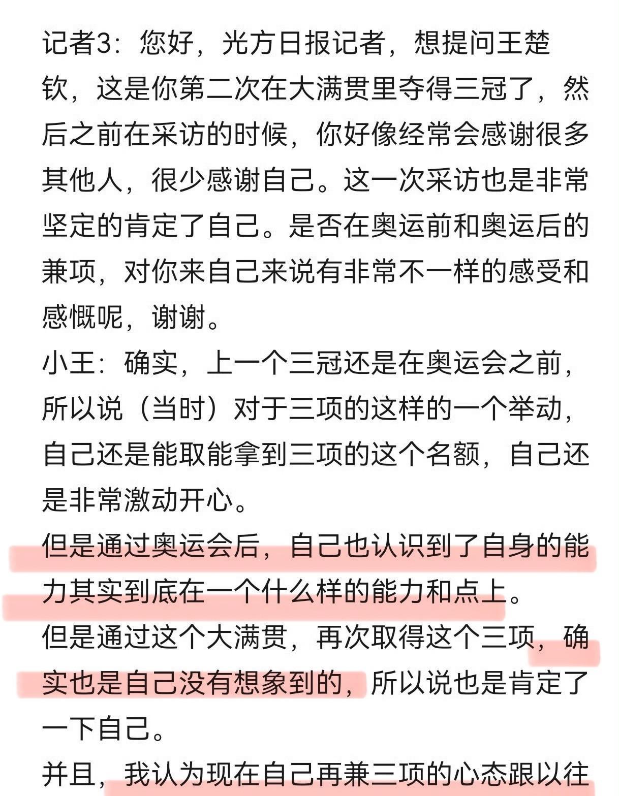 王楚钦中国大满贯实现三冠王后,采访4句话,表达4种婉拒“兼三项”[笑哭] 第一层拒绝:我上次三冠王还是在巴黎奥运会之前,那会儿不懂事,所以才会很激动。 “我那会儿真的是非常地欢欣雀跃,自己能够拿到三项的名额。” 第二层拒绝:在经历了巴黎奥运会惨案后,我现在对于自己的认识更加明确了,以后的兼三项我就不奉陪了哈。 【我终于认识到了我自己的能力到底在什么点上。】 第三层拒绝:不过我还是很喜出望外的,我在赛完全没有想到自己的上限居然真的还可以做到,在这个年纪,继续身兼三项,全部夺冠。 第四层一锤定音的拒绝:但我不是巴黎奥运会前的我了,兼三项活动,我就婉拒了哈。 这次王楚钦在记者提问过程中,首次被问起兼三项的感受,和男双入奥后的备战战略,他立即眼前一亮。 他和所有的记者媒体,强烈地表达了自己的情绪态度:太累了,我兼不动三项了,我自己都很惊讶我居然还真的还能做到身兼三项,全部夺冠。 【但新周期,我不适合这么做了。】 甚至连王励勤笑语盈盈去慰问他,王楚钦都找到机会,和他大声清晰表达了自己赛后感:我可太累了。 其实整个世界乒坛,群英荟萃,但是21世纪真的能够在世乒赛做到身兼三项,全部夺冠,唯王楠一个人而已。 兼三拿到冠军,和兼三但是以单打为主,是两码事。 男线最有效的兼三活动,也就是2000年以前的王涛,他一举荣获男双、混双冠军,但是男单仅获铜牌。 王涛表达过兼三其实真的很难。就算他有男单夺冠的能力【斩获两次全运会单打冠军】,但是他在三大赛【奥运会、世界杯、世乒赛】单打最好成绩最多亚军/季军。 而且王涛奥运会的对手甚至是他平时的小男仆刘国梁,王涛对刘国梁的成绩碾压程度,相当于雅典前的王皓之于柳承敏;巴黎前的王楚钦之于莫雷加德。 到了大球时代,国乒的绝对主力,就不用在世乒赛承担混双的任务了。2009年,李平/曹臻赢了张继科/木子拿到冠军。 许昕的兼三活动,也永远是把自己的单打“献祭”了,他意气风发勇夺男双、混双冠军的那届世乒赛,许昕单打喜提16强,输给了方博。 王楚钦在巴黎奥运会前只是个哈吉米,没有单打世界冠军加持,但是国乒和他自己,敢信自己兼三项,还能傲视群雄,是基于他的两次有效兼三经历。 一次是杭州亚运会,王楚钦创造历史,单打混双男双男团全部夺冠;一次是德班世乒赛,单打进决赛,男双、混双夺冠。 从巴黎奥运会来看,王楚钦的兼项能力,无法达到最尖端的那一个人。 其实男线除了刘国梁,压根没有人兼单打双打两项目,还全部夺冠的;接下来一档次是孔令辉,一冠一亚。 哪怕是王涛、王励勤、马琳、王皓这种兼项能力历代级别的,都惨淡收场。